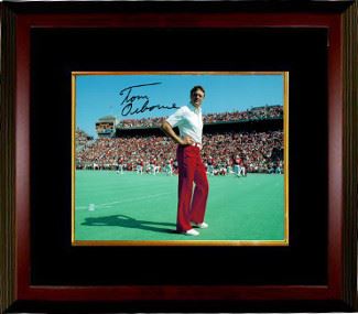 Tom Osborne is currently the athletic director at the University of Nebraska and coached college football there for 25 years. He also served 6 years in the U.S. House of Representatives for Nebraska. Osborne was a model of consistency. His teams never won fewer than nine games in a season, finished in the top 15 of the final AP poll 24 years out of 25 (having finished 24th in 1990), and were ranked in every single weekly AP poll barring one week in 1977 and two in 1981. Osborne's teams won outright national championships in 1994 and 1995, and a share of another in 1997. Osborne's Huskers also won or shared 12 Big Eight Conference titles and one Big 12 Conference title. Osborne was inducted into the College Football Hall of Fame in 1999. Tom Osborne has hand signed this 8x10 Photo. Schwartz Sports Hologram Certificate of Authenticity from Athlon Sports. Custom Black Mat and Premium mahogany Frame as shown.
