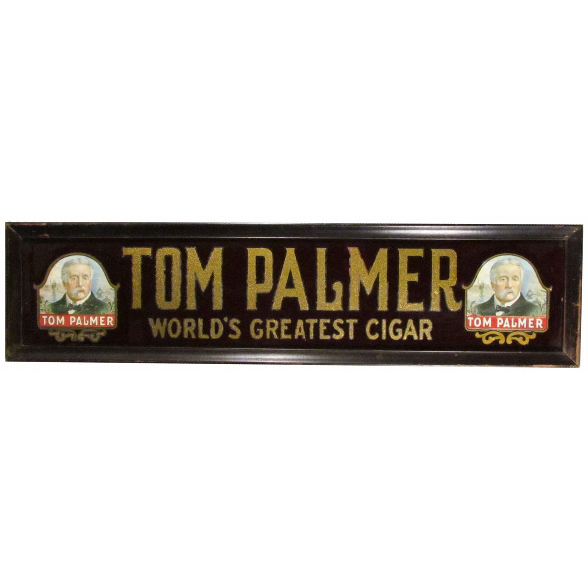 Tom Palmer Cigars Reverse Glass Sign. Excellent condition. 29 X 7 inches overall.