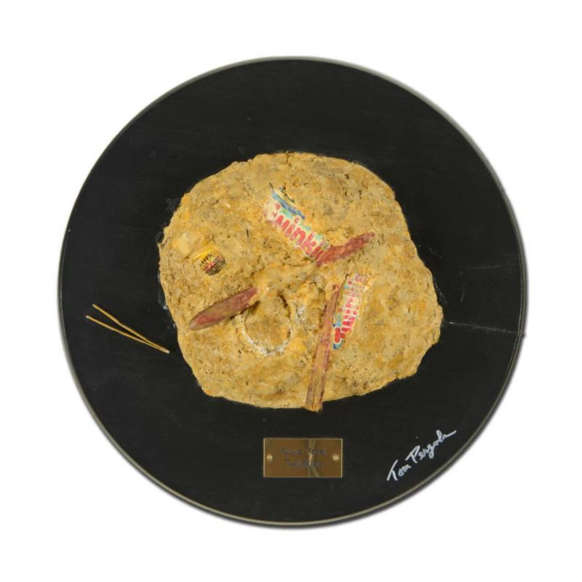 "Future Fossil: Twinkies" is an original mixed media sculpture by Tom Pergola, hand signed by the artist. This piece comes mounted on wood. Includes Letter of Authenticity. Measures approx. 18" (diameter) x 4" (depth). Reference #: 242999
