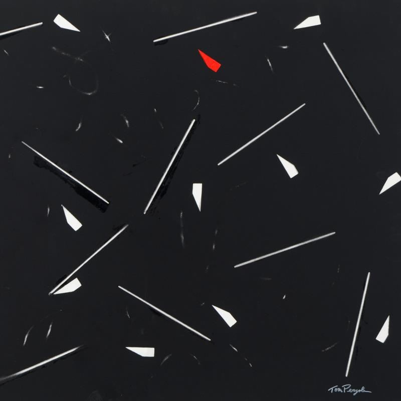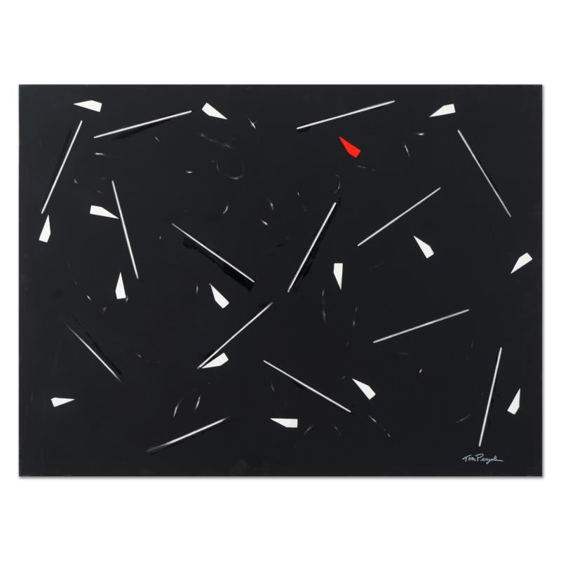 "One Red One" is an original mixed media on canvas by Tom Pergola, hand signed by the artist. This piece comes gallery wrapped. Includes Certificate of Authenticity. Measures approx. 40" x 30" (image).