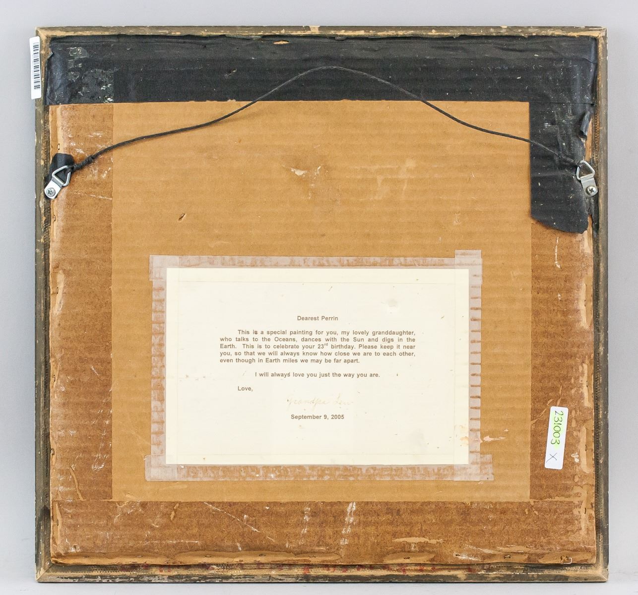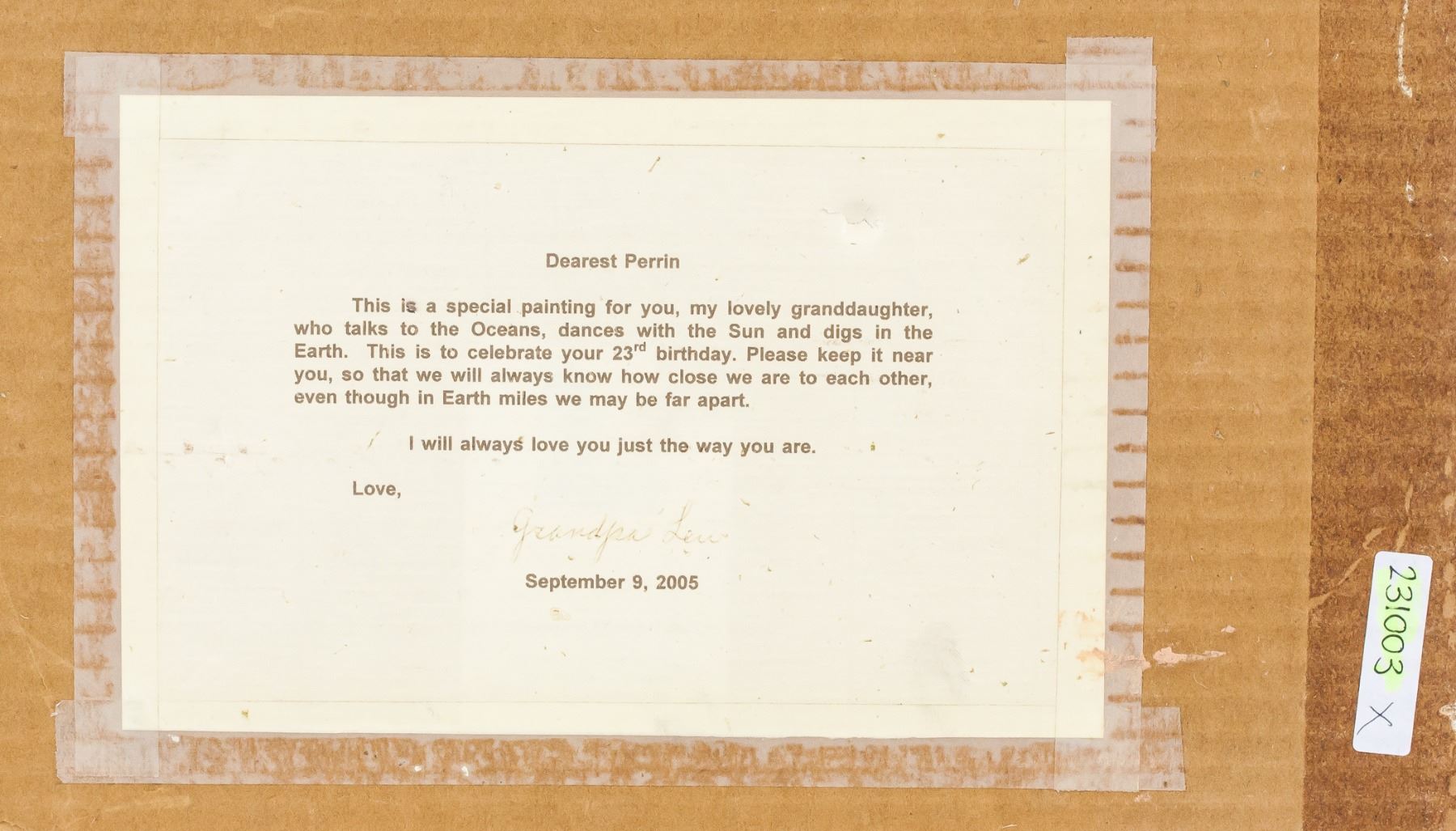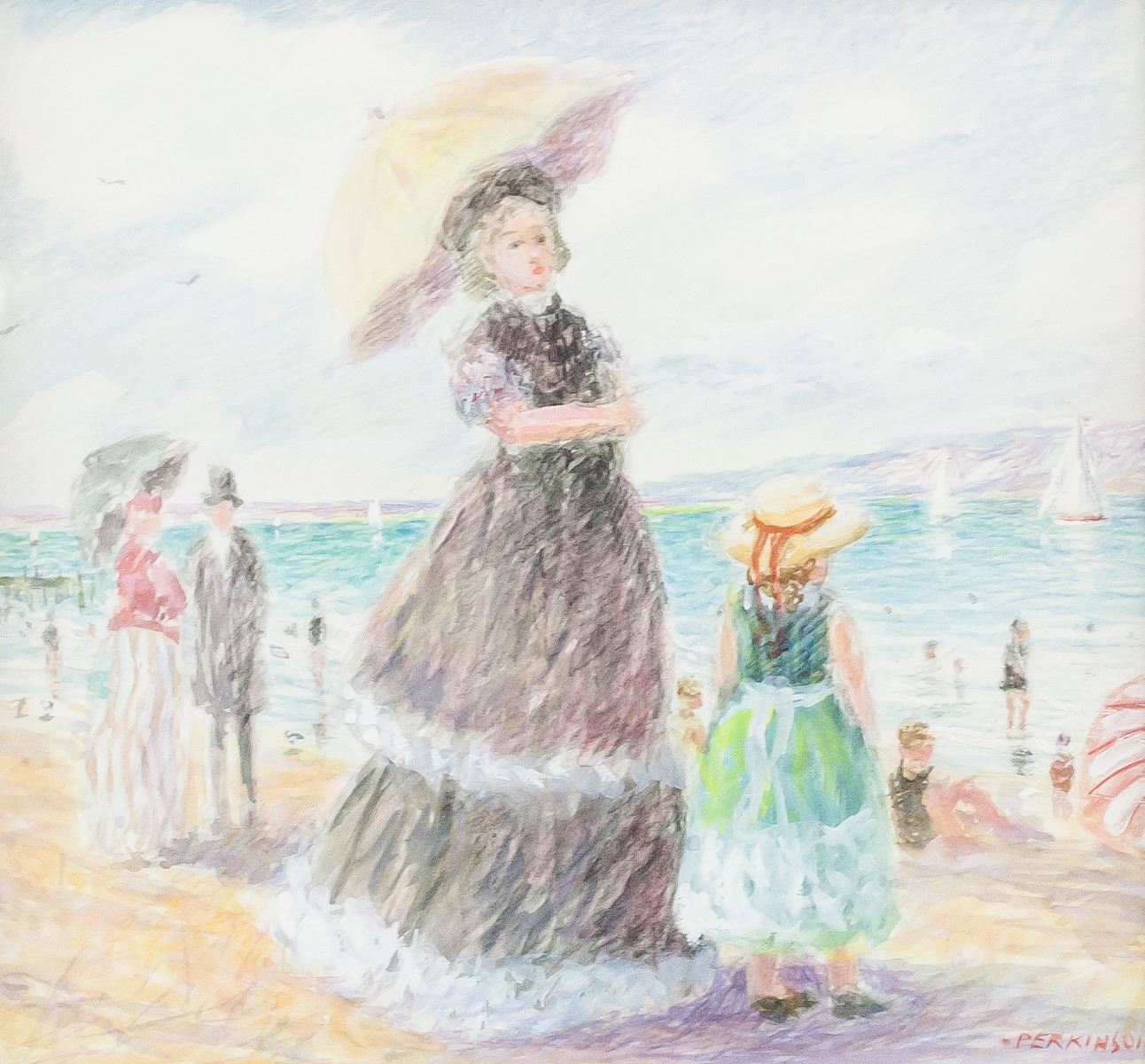 Watercolor on paper, framed. Featuring woman with child at a beach. Signed "Perkinson" in the bottom right corner. Tag tucked into front of frame reads " Lot#: 242 QTty: 1 Tom Perkinson, "Sunny Day On The Beach" Watercolor Tom Perkinson (American, b. 1940). "Sunny Day On The Beach" - late 20th century, watercolor and gouache on paper. signed "Perkinson" to lower right and a hand written letter to the verso. Approx. (sight size) 7.75" x 8", (frame) 15.75" x Estimate: 300.00-500.00 ID: 77 Inv#: 231003". Paper affixed to verso reads "Dearest Perrin This is a special painting for you, my lovely granddaughter, who talks to the Oceans, dances with the Sun and digs in the Earth. This is to celebrate your 23rd birthday. Please keetp it near you, so that we will always know how close we are to each other, even though in Earth miles we may be far apart. I will always love you just the way you are. Love, grandpa Lew September 9, 2005." Attributed to Tom Perkinson (1940-, American). 19 x 20 cm (7.5 x 8 in), Frame: 40 x 41 cm (16. x 16.25 in)
