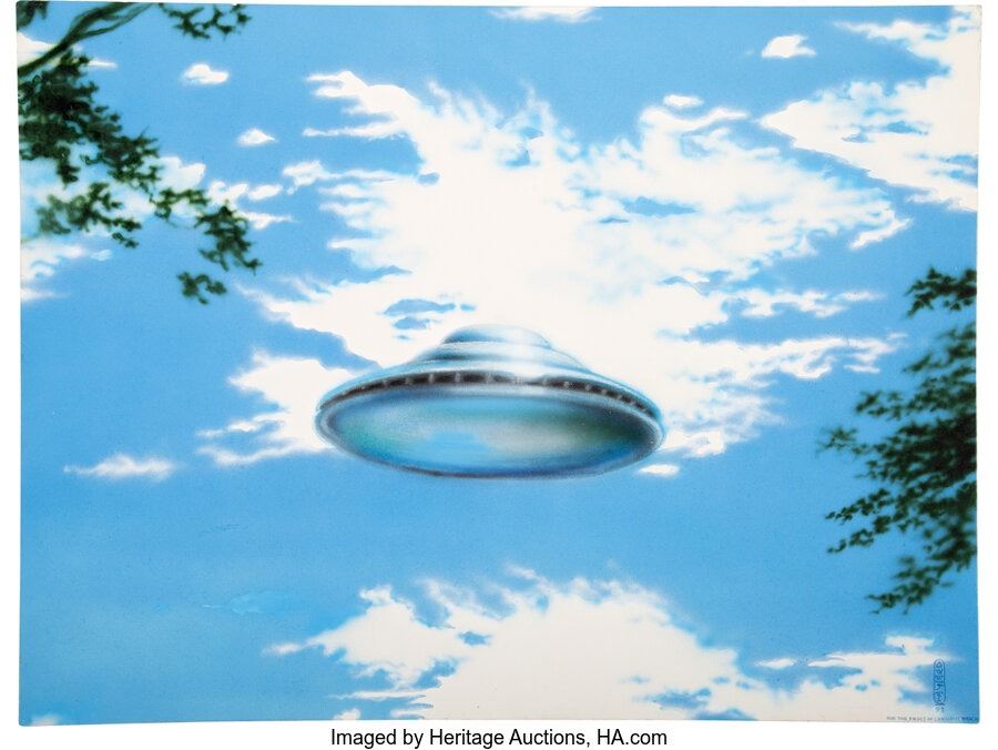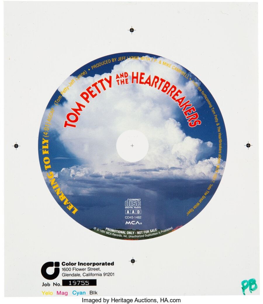 Tom Petty and the Heartbreakers "Learning To Fly" Original Artwork For CD Single Back Cover. This is the original air-brushed artwork for the back of the "Learning to Fly" CD single, released in 1991. Per the typed note on the protective sheet, this was made by Awest and described by Tiny Bouchet. This was another hit for Tom Petty, returning to the charts with his Heartbreakers for the Into the Great White Openafter a successful turn as a solo artist with Full Moon Fever.Artwork measures 20" x 15" and made on thick backing board. Comes with a color print of the single's label, as well as a CD promo copy of the single. Overall, in Near Mint condition. COA from Heritage Auctions.
