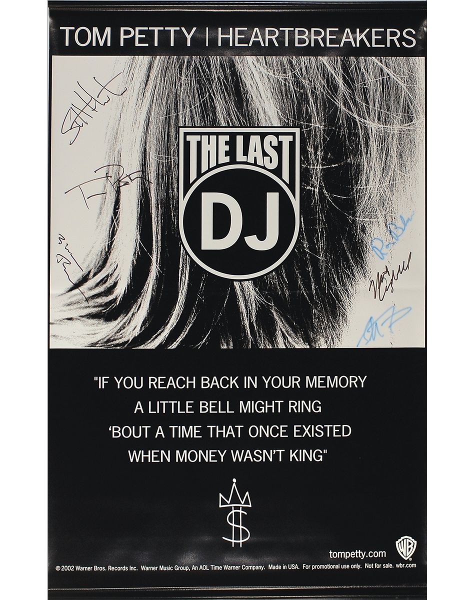 Color vinyl banner for The Last DJ, 23.5 x 37.5, signed in blue and black felt tip by Tom Petty, Mike Campbell, Benmont Tench, Ron Blair, Scott Thurston, and Stan Lynch. In fine condition, with light uniform fading to two signatures. Accompanied by a letter of provenance from the original recipient. Rolled.