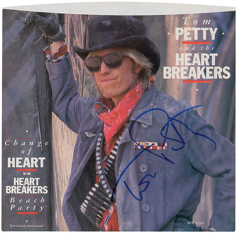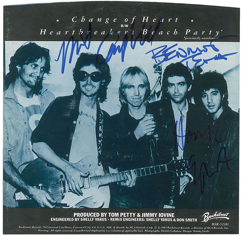 Color 45 rpm record sleeve for ‘Change of Heart,’ signed on the front in blue felt tip by Tom Petty and on the reverse by Benmont Tench, Howie Epstein, and Mike Campbell. In fine condition. Accompanied by a full letter of authenticity from Roger Epperson/REAL.