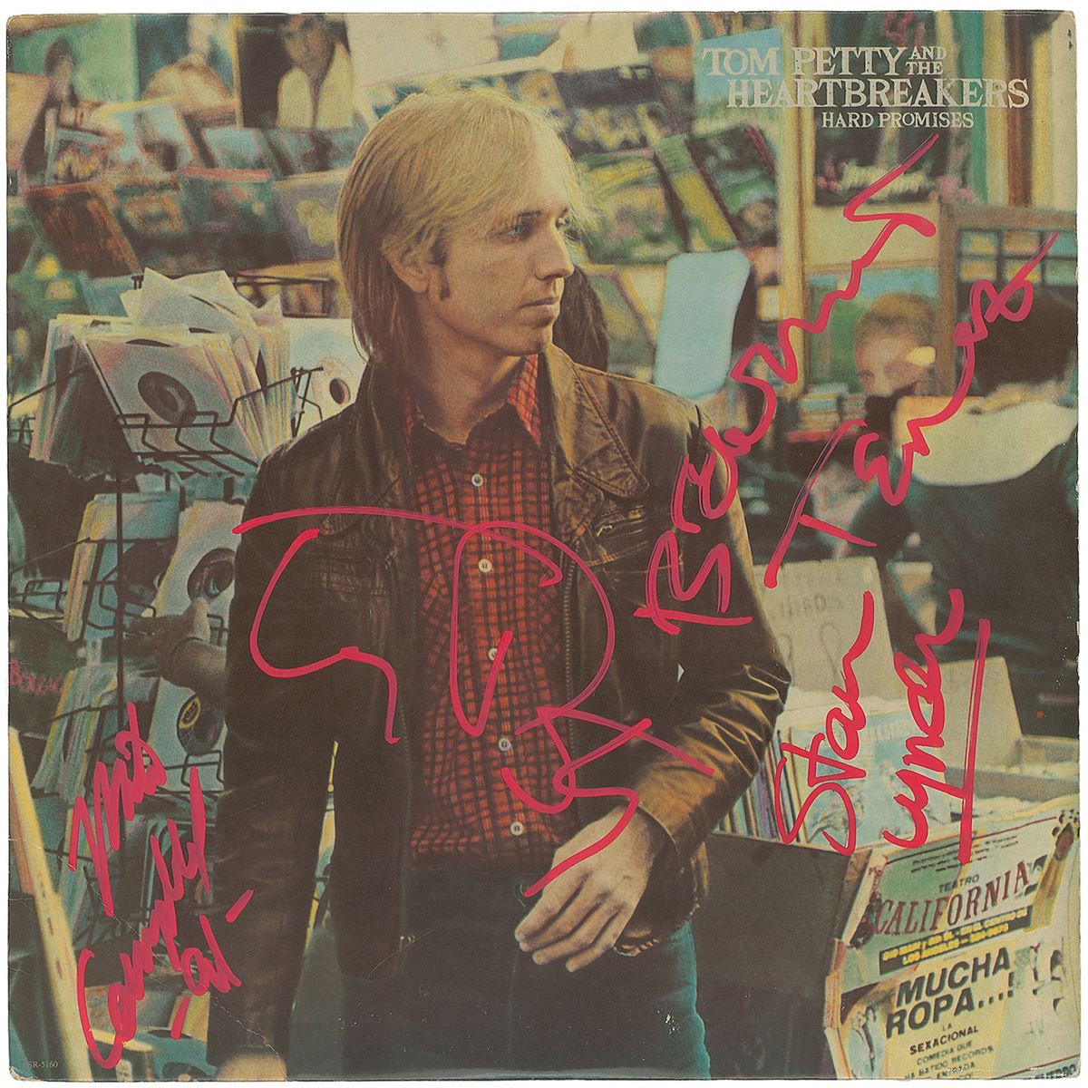 Hard Promises album signed on the front cover in red paint pen by Tom Petty, Mike Campbell, Benmont Tench, and Stan Lynch. In fine condition, with a crease to lower left corner (passing through a portion of the Campbell signature) and trivial edgewear and creasing. The record is included. Consignor notes that the signatures were obtained before a show at the Blossom Music Center in Cuyahoga Falls, Ohio.
