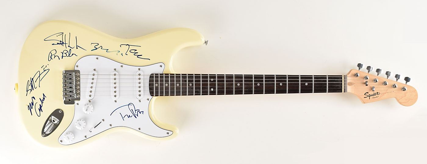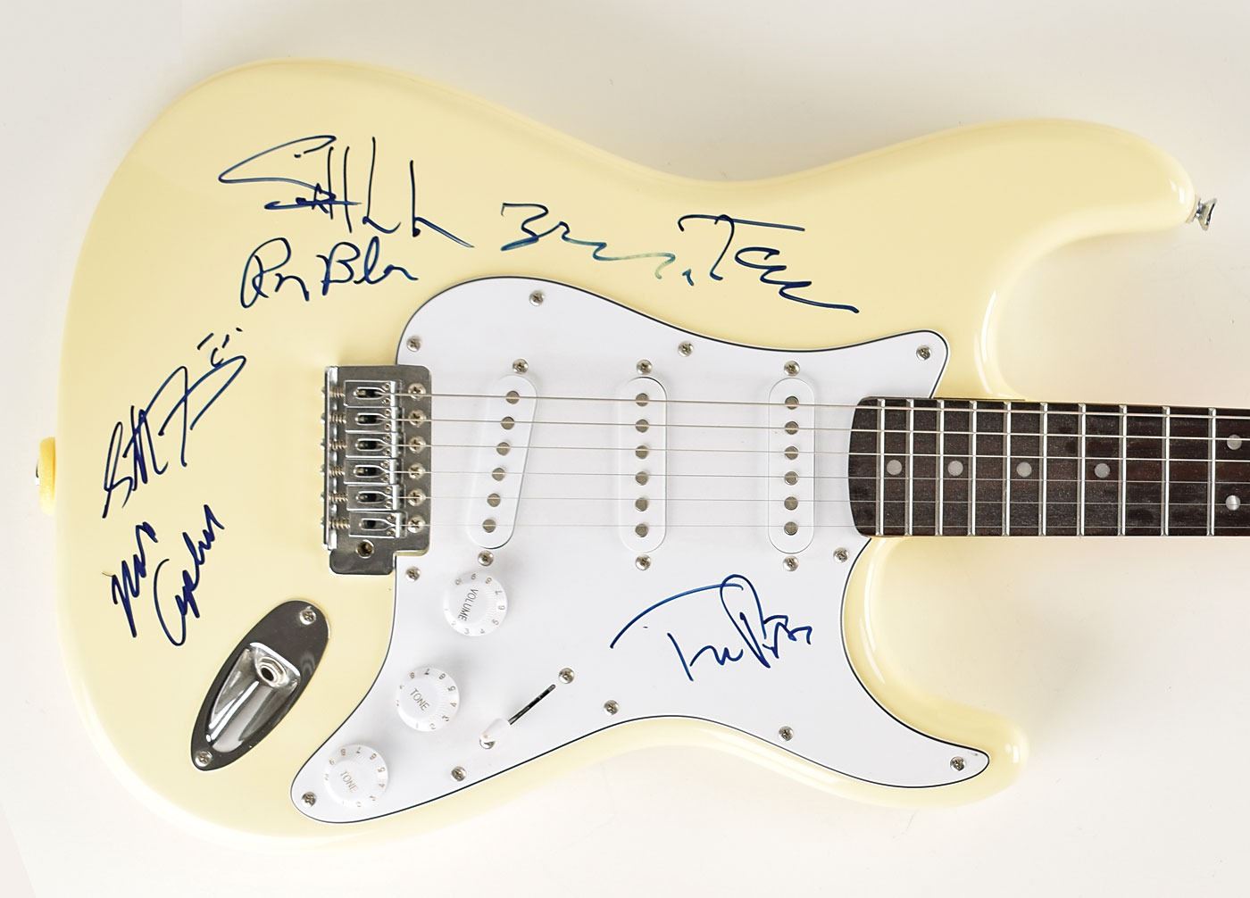 Cream-bodied Fender Squier Bullet Stratocaster electric guitar, signed on the white pickguard in blue felt tip by Tom Petty, and on the body by Mike Campbell, Benmont Tench, Ron Blair, Scott Thurston, and Steve Ferrone. In fine condition. Accompanied by a full letter of authenticity from JSA.