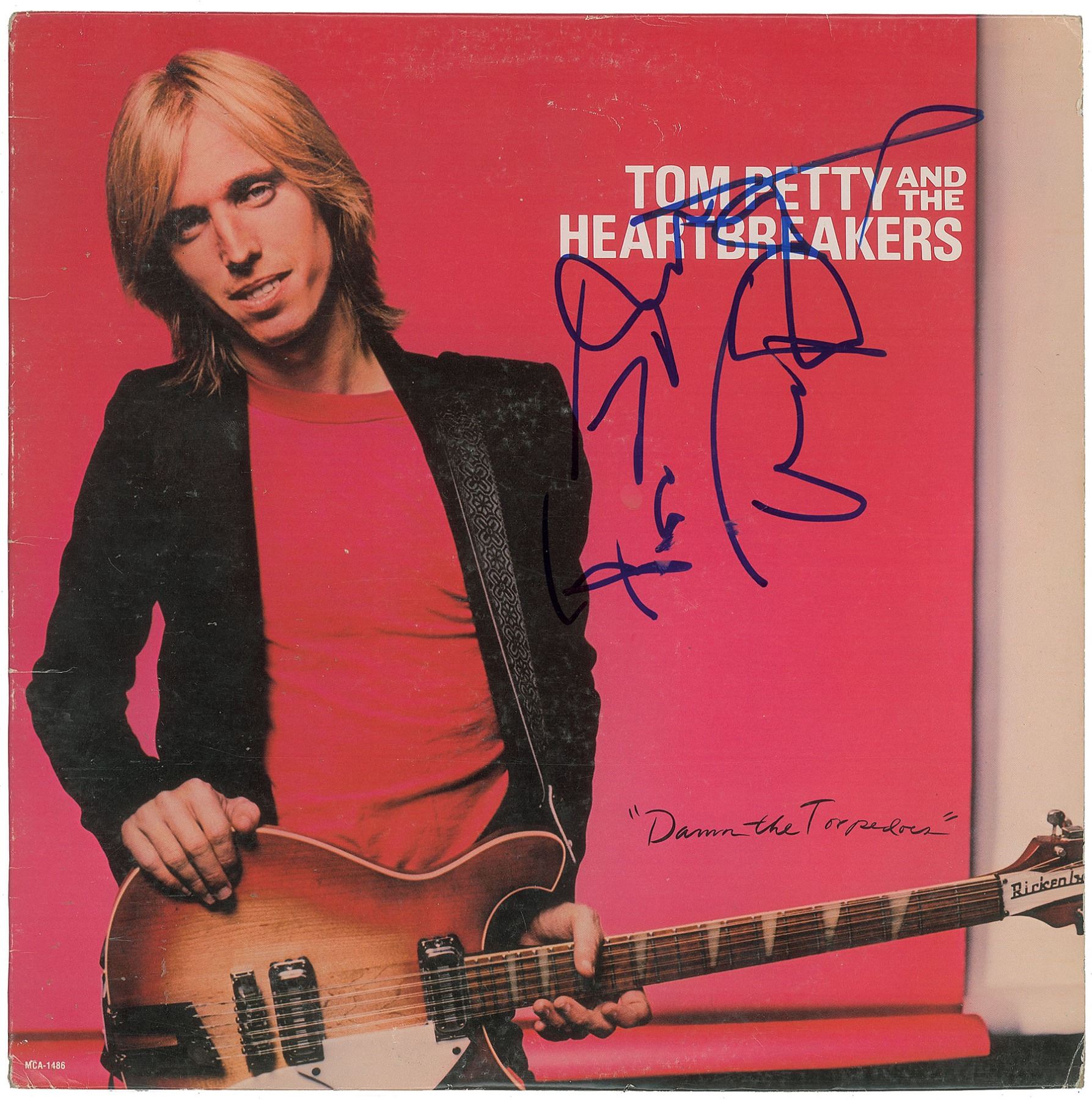 Damn the Torpedoes album signed and inscribed vertically on the front cover in blue felt tip, "For John, Tom Petty." In fine condition, with light scuffing. The record is included.