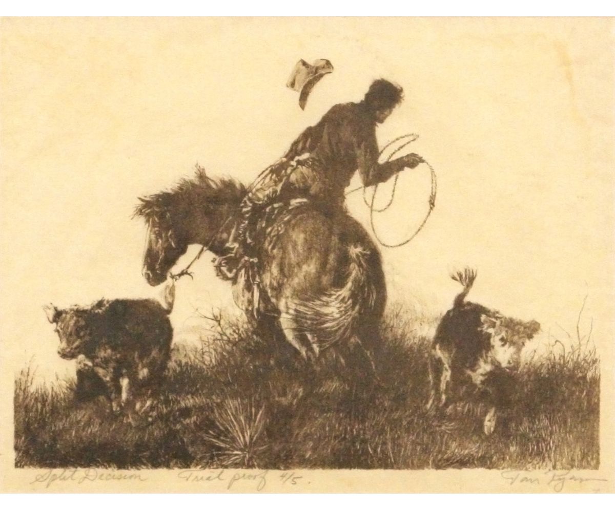 Tom Ryan (1922 - 2011) CA. Split Decision. 10" x 13" lithograph. Pencil signed lower margin: Split Decision Trial Proof 4/5 Tom Ryan.