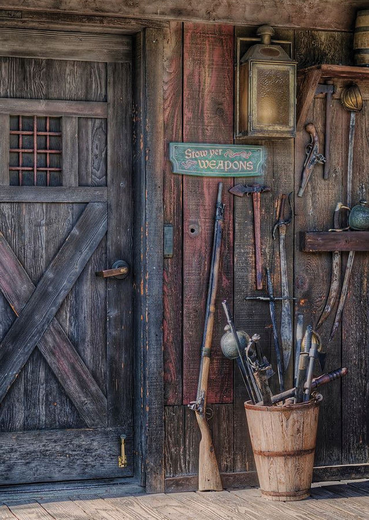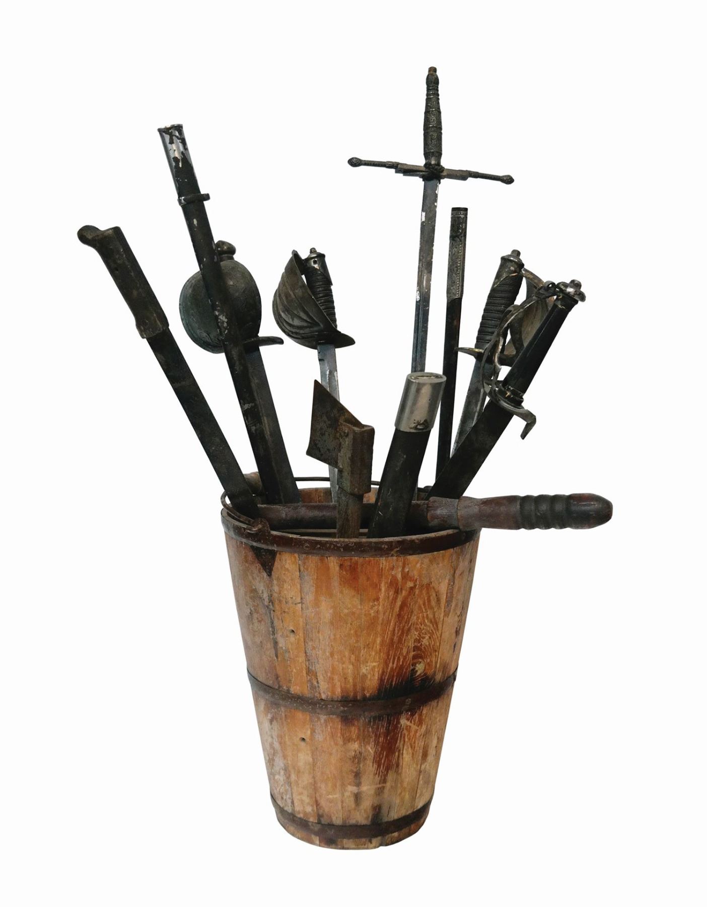 (Disneyland, 2007) A set of prop pirate weapons used on Tom Sawyer Island. The props were installed in 2007 at Lafitte's Tavern for the re-opening of the attraction as "Pirate's Lair on Tom Sawyer Island." Many of the weapons feature screw holes along their tips where they were bolted in place for guest safety. The set includes (6) swords, a wooden club, a hatchet, a few sheaths, and the original wooden bucket. The prop stands 40" tall at its highest point, and is in good overall condition with some wear throughout, including some small chips or breaks to some of the handles from park-use. This item will require special shipping arrangements, please contact us for details and estimates.