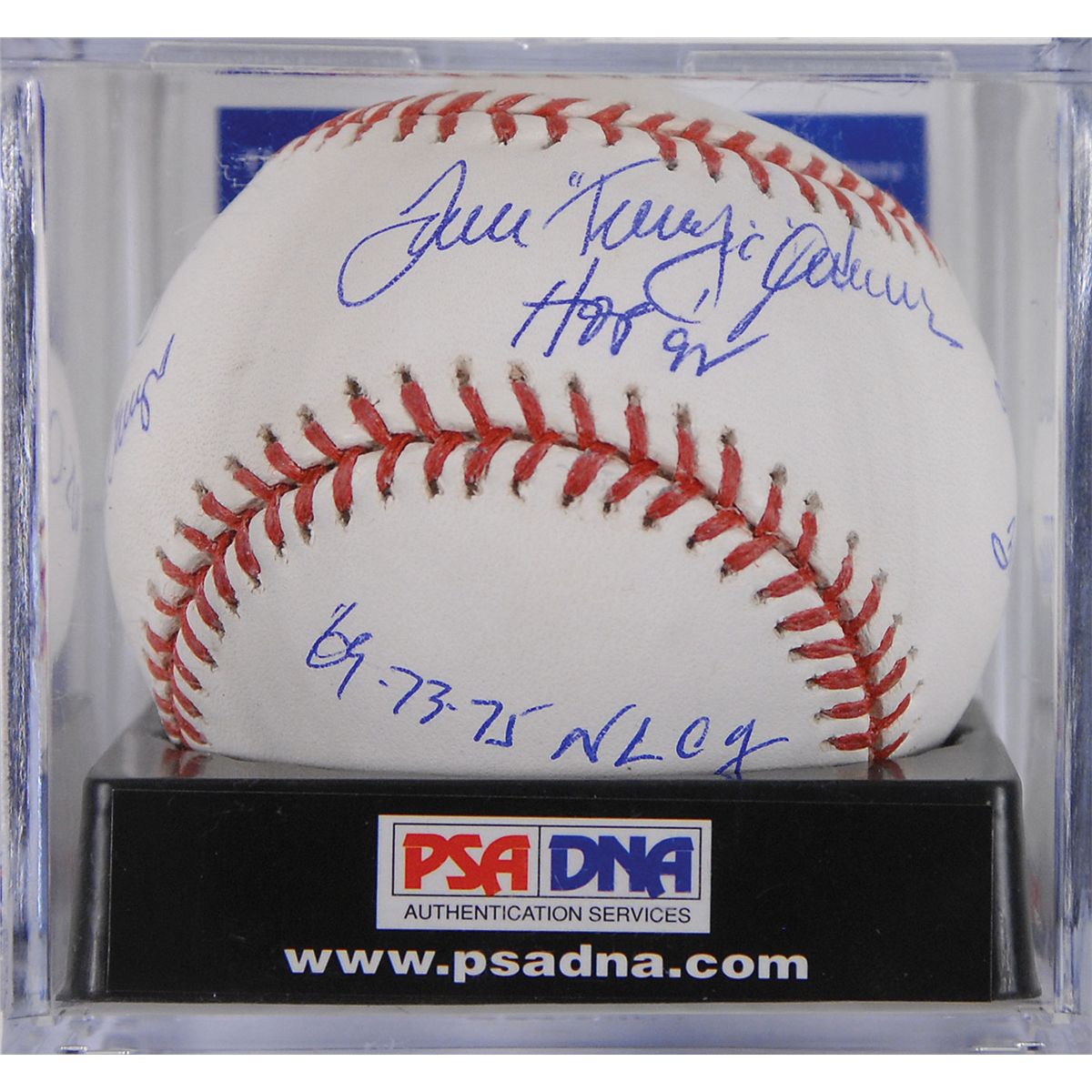 Official Rawlings Major League baseball signed in blue ballpoint on the sweet spot, “Tom ‘Terrific’ Seaver, HOF 92,” adding his career stats to the side panels, “67 NL ROY,” “69 WS Champs,” “3640 K’s,” “311 W’s,” and “69-73-75 NL CY.” Encapsulated in a plastic PSA/DNA authentication holder. In very fine condition. Accompanied by a certificate of authenticity and grading from PSA/DNA, giving the baseball an overall grade of “9.”