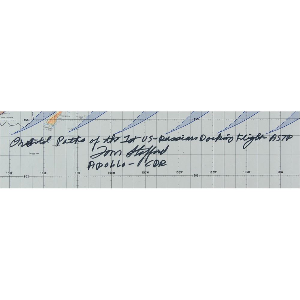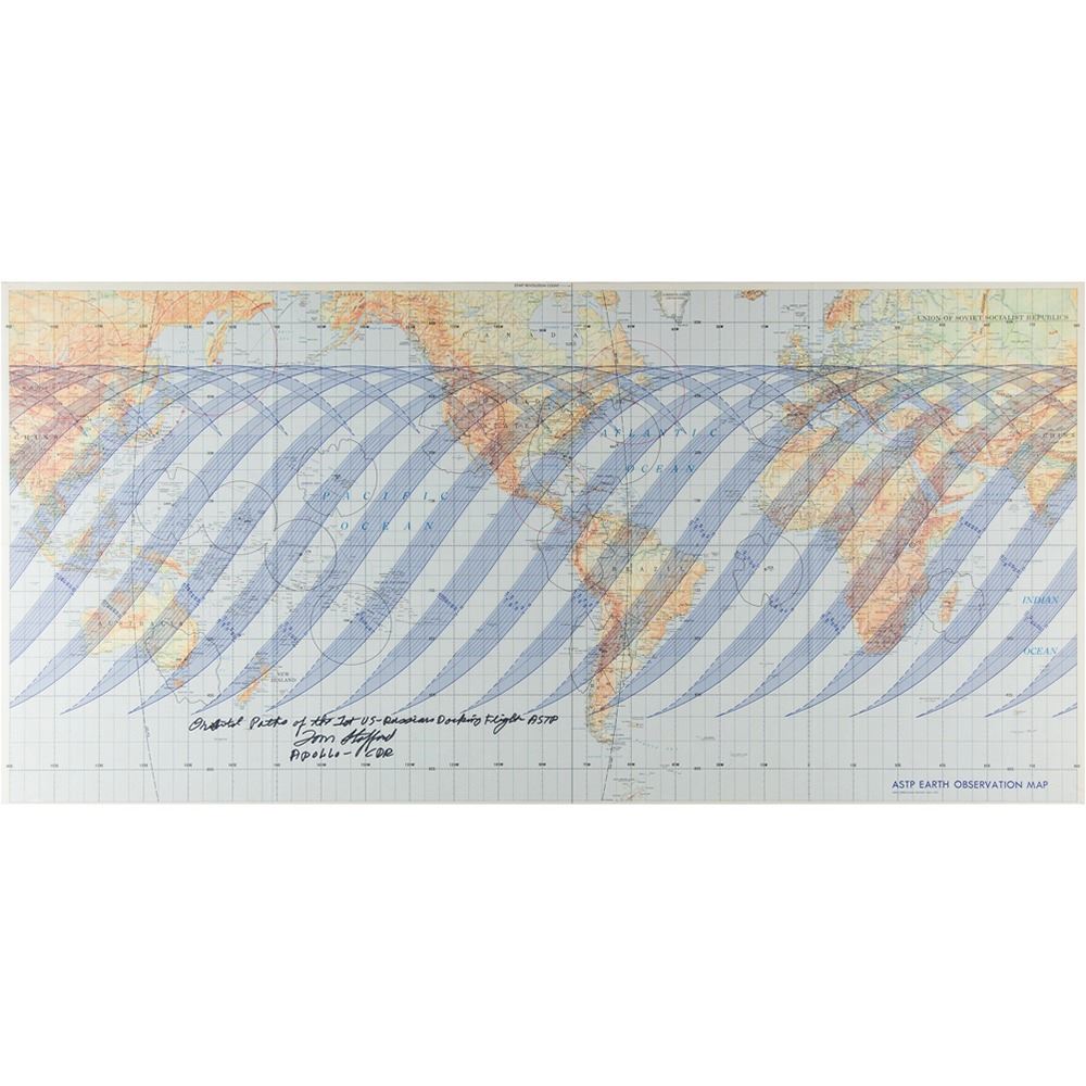 Desirable color 'first operational edition' of the Apollo-Soyuz Test Project Earth Observation Map, 39.75 x 19.25, dated May 1975, boldly signed in black felt tip, "Orbital paths of the 1st US-Russian Docking Flight—ASTP, Tom Stafford, Apollo CDR." In fine condition, with intersecting folds.