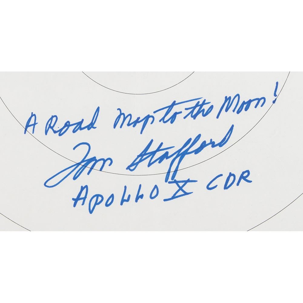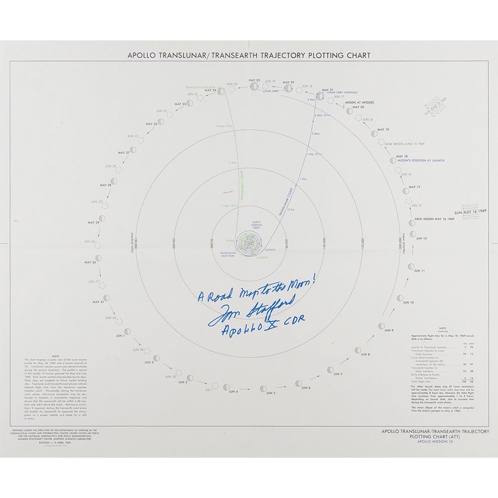 Color first edition of the Apollo 10 Translunar/Transearth Trajectory Plotting Chart (ATT), 24 x 20, dated April 15, 1969, prominently signed in blue felt tip, "A Road Map to the Moon! Tom Stafford, Apollo X CDR." The chart displays a polar view of the lunar mission profile for Apollo 10, showing the various significant events during the 8-day mission. Lithographed by ACIC 4-69, and prepared under the direction of the Department of Defense by the Aeronautical Chart and Information Center. In fine condition, with central vertical and horizontal folds.