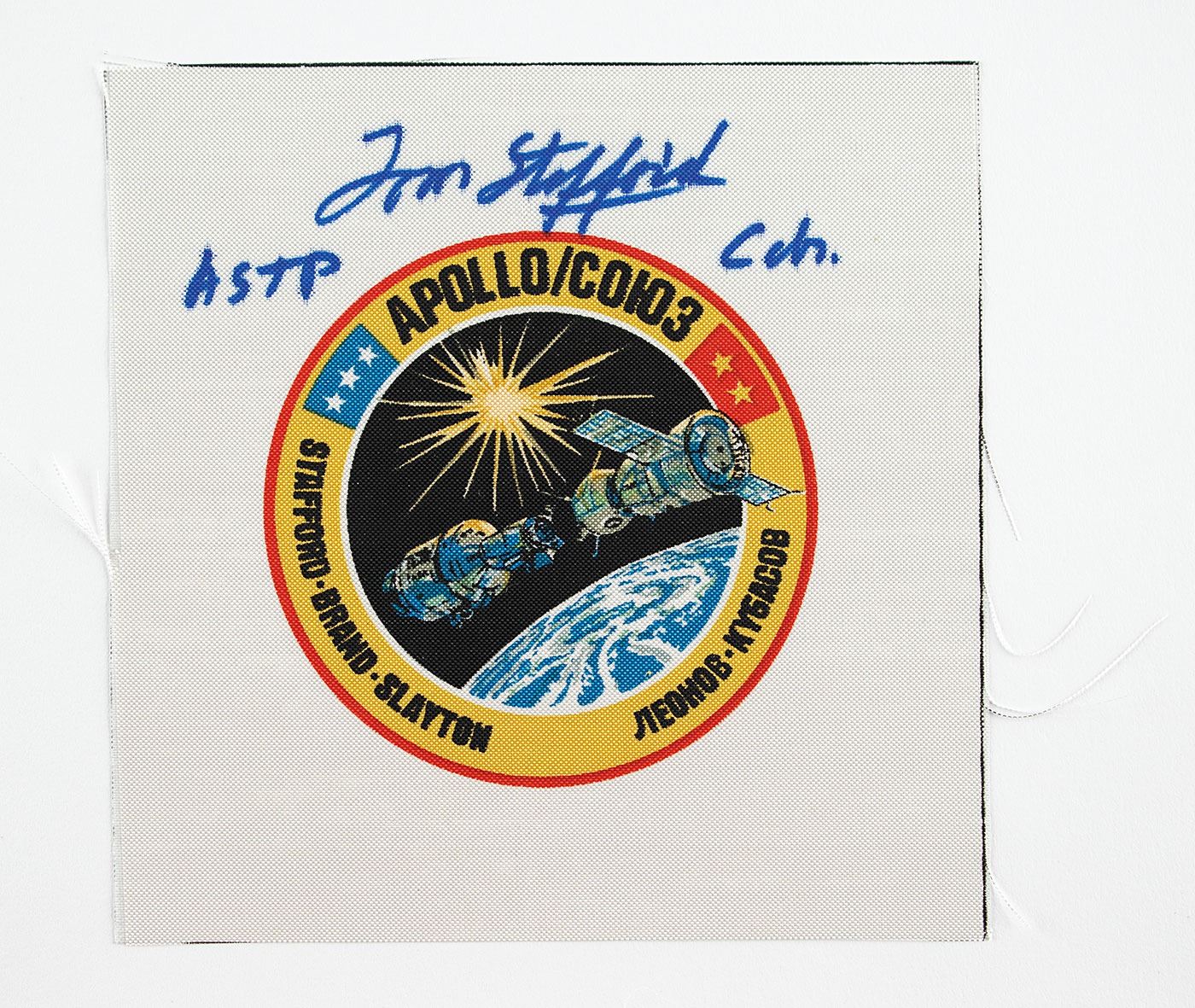 Appealing 5.5˝ x 5.5˝ swatch of Beta cloth bearing a 3.5˝ diameter emblem of the Apollo–Soyuz Test Project, signed above in blue felt tip, "Tom Stafford, ASTP, Cdr." In very fine condition.
