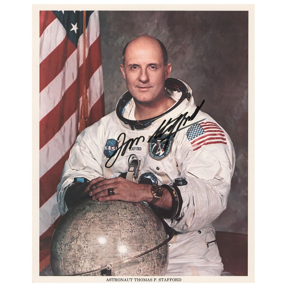 Official color 8 x 10 NASA lithograph of Stafford posing in his white space suit with a lunar globe, boldly signed in black felt tip. In fine condition.