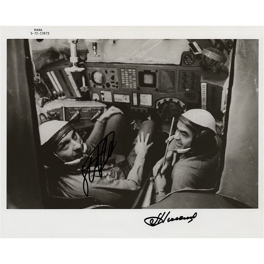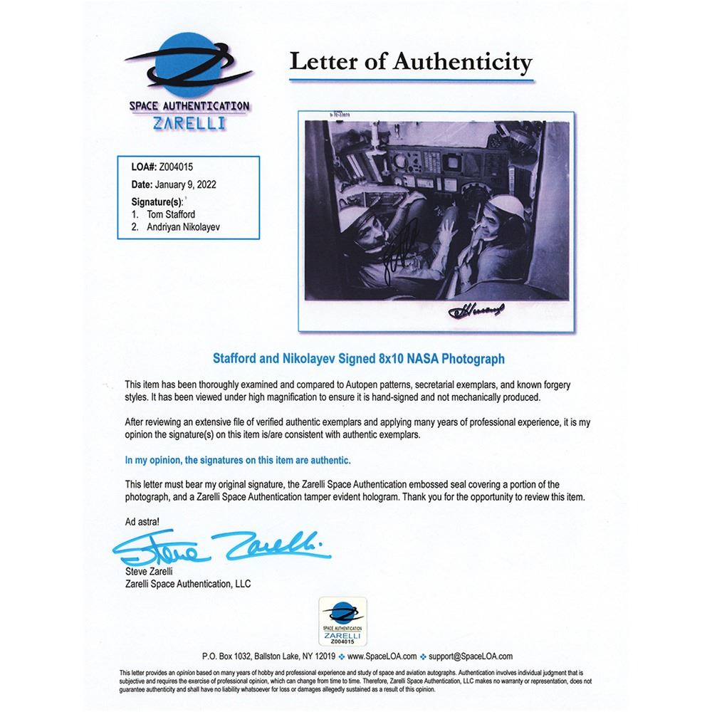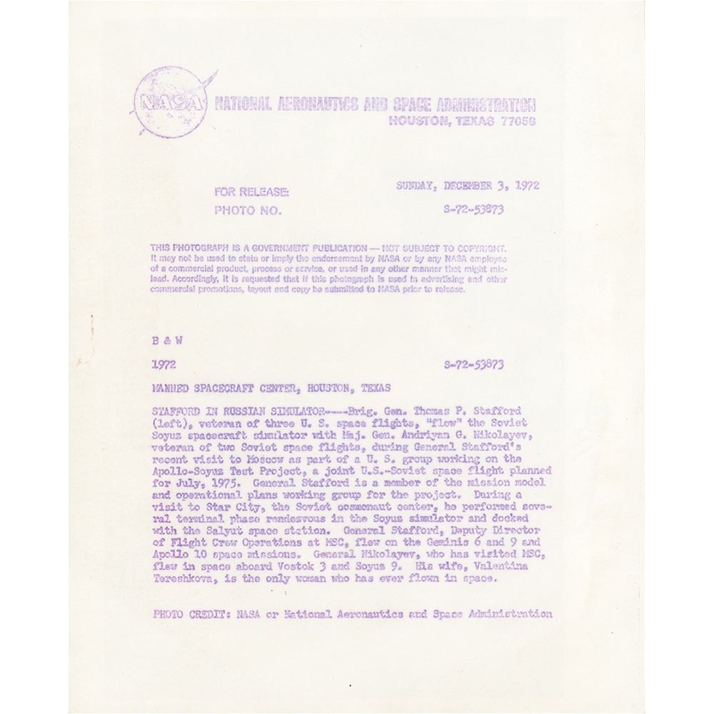 Official glossy 10 x 8 numbered NASA photo (S-72-53873) of astronaut Tom Stafford using the Soviet Soyuz spacecraft simulator with cosmonaut Andriyan Nikolayev during the astronauts' training visit to Moscow, signed by both men in black felt tip. Reverse bears purple NASA caption text. In fine condition, with scattered small surface creases. Accompanied by a full letter of authenticity from Zarelli Space Authentication.