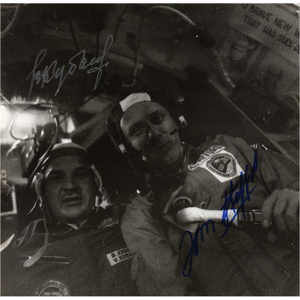 Glossy 6.5 x 6.5 Russian press photo of astronaut Tom Stafford and cosmonaut Valery Kubasov during the historic Space Race-ending Apollo–Soyuz Test Project, signed in blue felt tip by Stafford and in silver ink by Kubasov. Reverse bears "This Paper Manufactured by Kodak" watermarks, as well as credit stamps and captions. In fine condition. Accompanied by a full letter of authenticity from Zarelli Space Authentication.