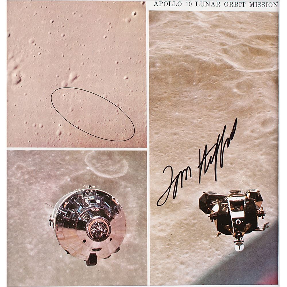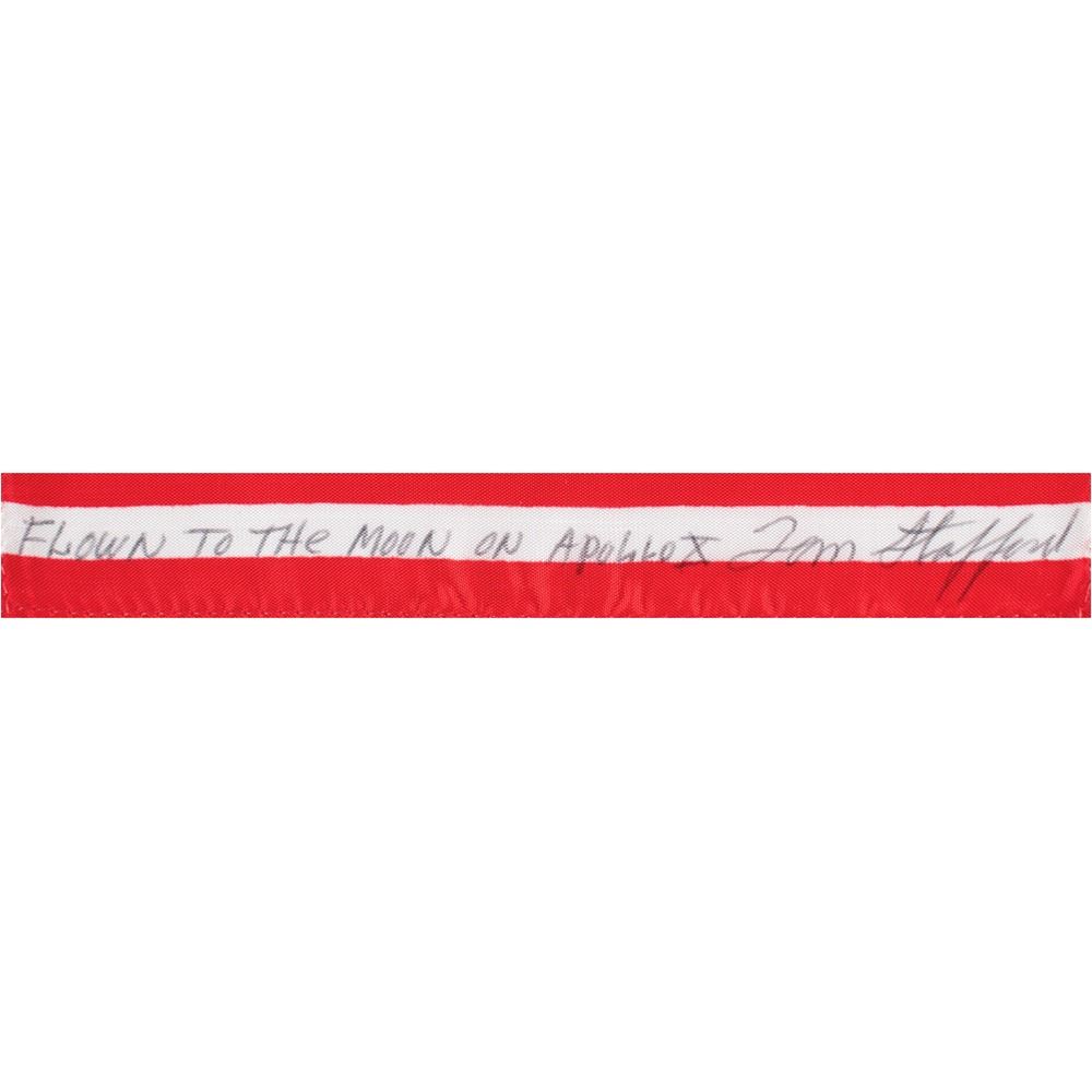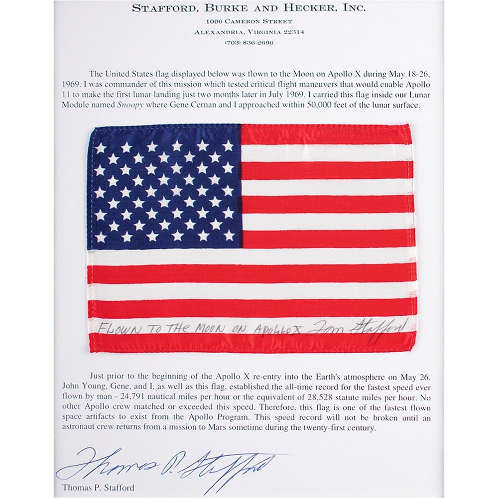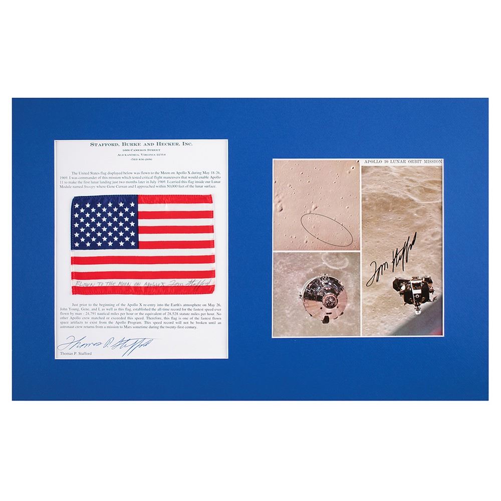 Flown American flag carried into lunar orbit during the Apollo 10 mission, 6" x 4", signed and flight-certified in black ballpoint, "Flown to the moon on Apollo X, Tom Stafford." The flag is attached to a letter of provenance signed "Thomas P. Stafford," written on his personal stationery, which reads: "The United States flag displayed below was flown to the Moon on Apollo X during May 18-26, 1969. I was commander of this mission which tested critical flight maneuvers that would enable Apollo 11 to make the first lunar landing just two months later in July 1969. I carried this flag inside our Lunar Module named Snoopy where Gene Cernan and I approached within 50,000 feet of the lunar surface. Just prior to the beginning of the Apollo X re-entry into the Earth's atmosphere on May 26, John Young, Gene, and I, as well as this flag, established the all-time record for the fastest speed ever flown by man-24,791 nautical miles per hour or the equivalent of 28,528 statute miles per hour. No other Apollo crew matched or exceeded this speed. Therefore, this flag is one of the fastest flown space artifacts to exist from the Apollo Program. The speed record will not be broken until an astronaut crew returns from a mission to Mars sometime during the twenty-first century." Matted with a NASA lithograph collage of the Apollo 10 lunar orbit mission, which is signed in black felt tip by Stafford, to an overall size of 19.5 x 12.5. In very fine condition.