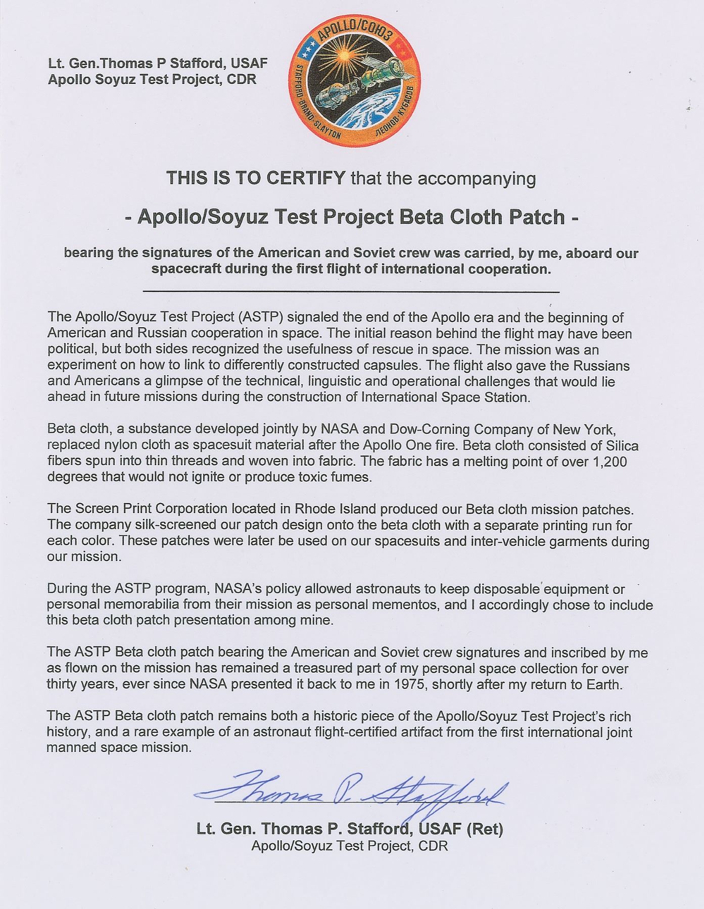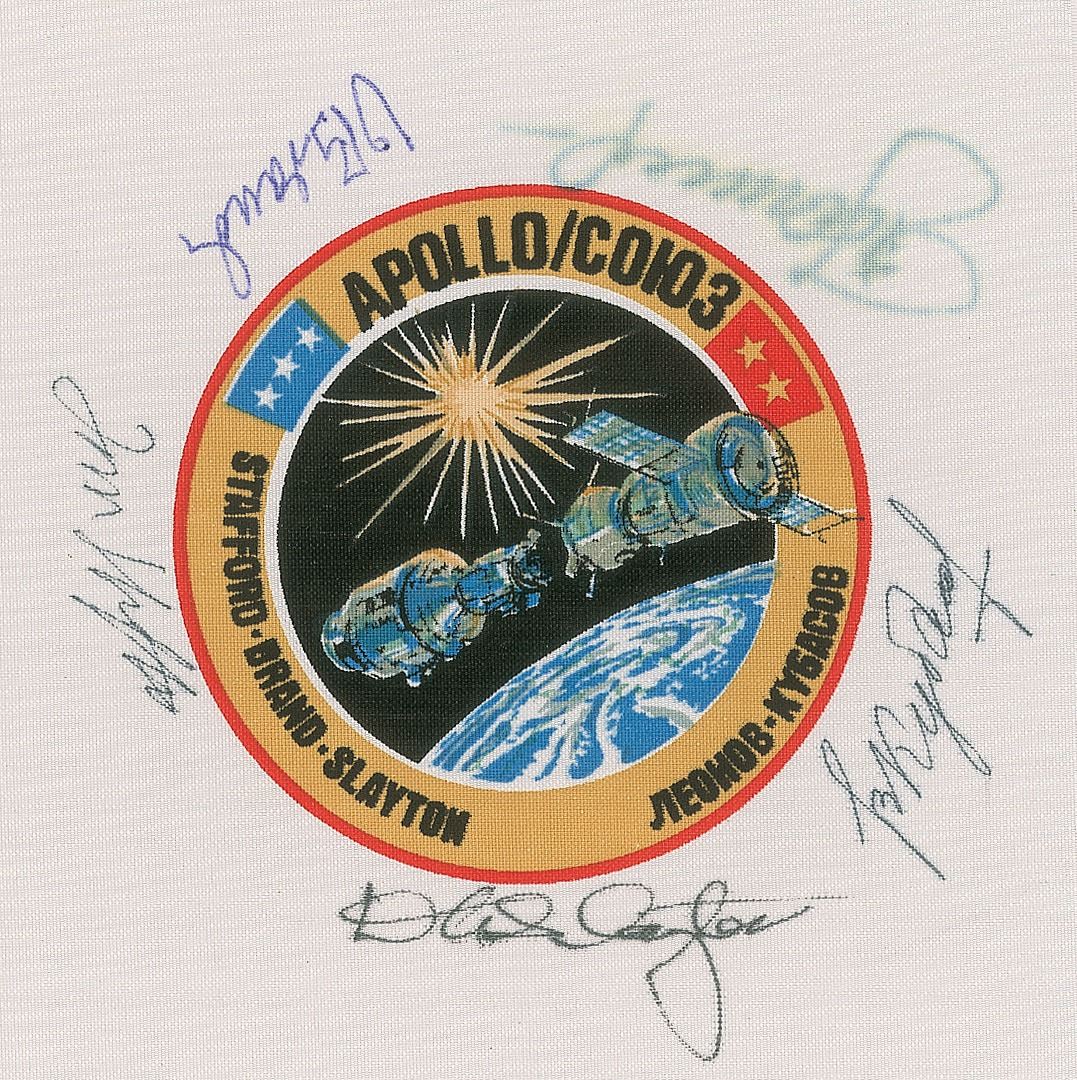 Rare flown 5.5 x 5.5 swatch of Beta cloth bearing a 3.5? diameter emblem of the Apollo–Soyuz Test Project, signed around the insignia in black ink by Thomas Stafford, Deke Slayton, and Valeri Kubasov, in green ink by Alexei Leonov, and in purple ink by Vance Brand. In fine condition, with light fading to Leonov. Accompanied by a signed letter of authenticity from Commander Stafford, in part: “This is to certify that the accompanying Apollo/Soyuz Test Project Beta Cloth Patch bearing the signatures of the American and Soviet crew was carried, by me, aboard our spacecraft during the first flight of international cooperation…During the ASTP Program, NASA’s policy allowed astronauts to keep disposable equipment or personal memorabilia from their mission as personal mementos, and I accordingly chose to include this beta cloth patch presentation among mine. The ASTP Beta cloth patch bearing the American and Soviet crew signatures…has remained a treasured part of my personal space collection for over thirty years, ever since NASA presented it back to me in 1975, shortly after my return to Earth.” The ASTP Beta cloth patch remains both an historic piece of the Apollo–Soyuz Test Project’s rich history which ended the Cold War human space race, and a rare example of an astronaut flight-certified artifact from the first international joint manned space mission.