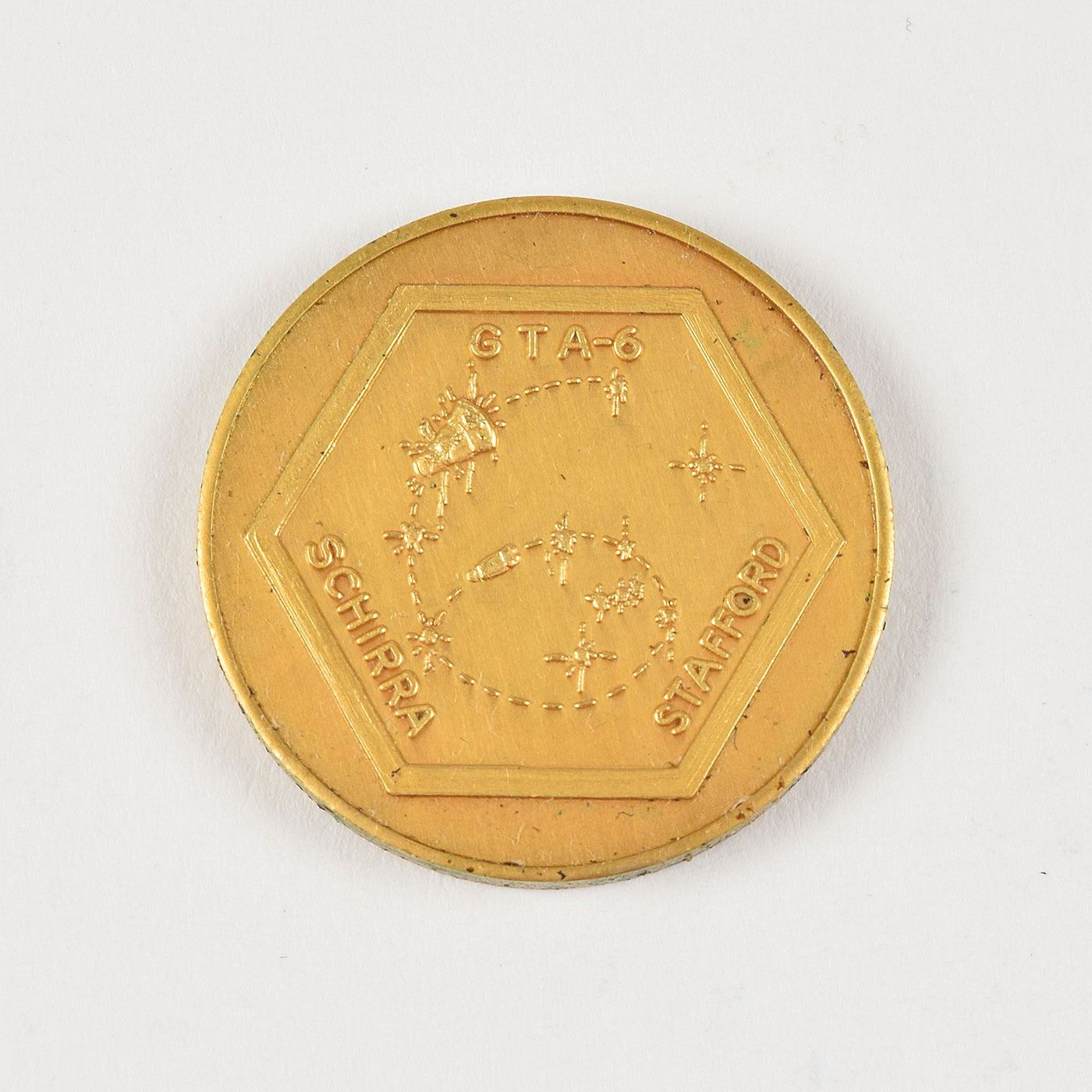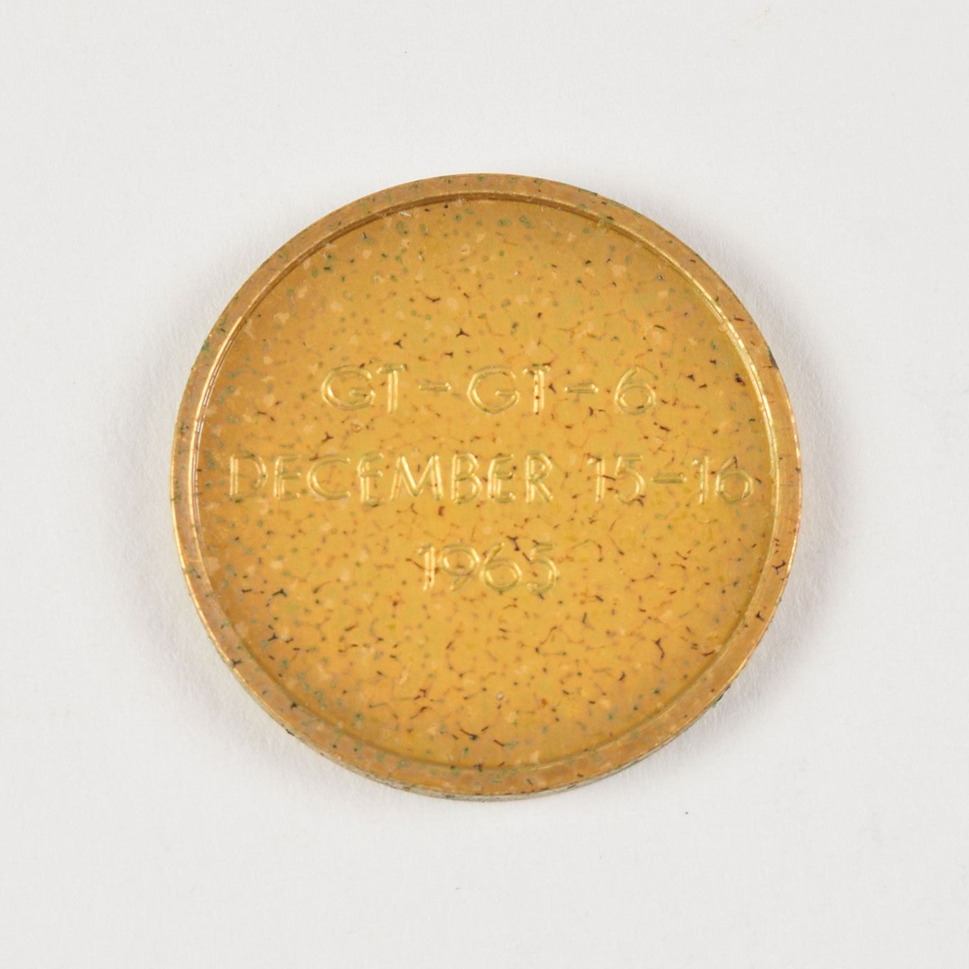 Flown Gemini 6 Fliteline gold-plated medallion, 1? diameter, with the front featuring a raised design of the mission insignia, the reverse engraved with the mission date, “December 15–16, 1965,” as well as “GT–GT–6,” and the rim marked “E.” Condition is mint state, with slight wear to rim. Includes the original Fliteline case. A highly desirable flown medallion given that of the few examples that traveled with Wally Schirra and Tom Stafford on the Gemini 6 mission—which achieved the first manned rendezvous with another spacecraft, its sister Gemini 7 capsule—only 10 were gold-plated, with the balance minted in silver.