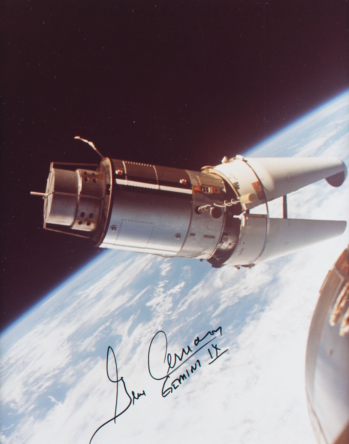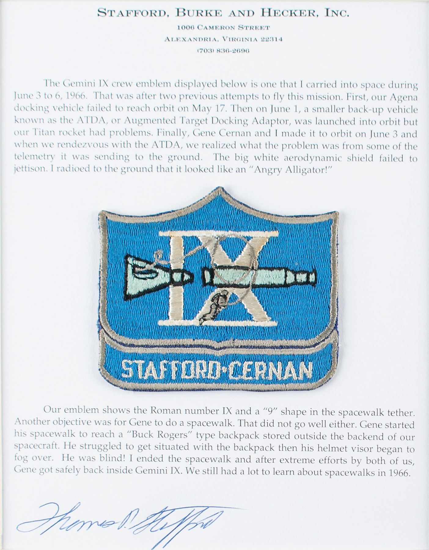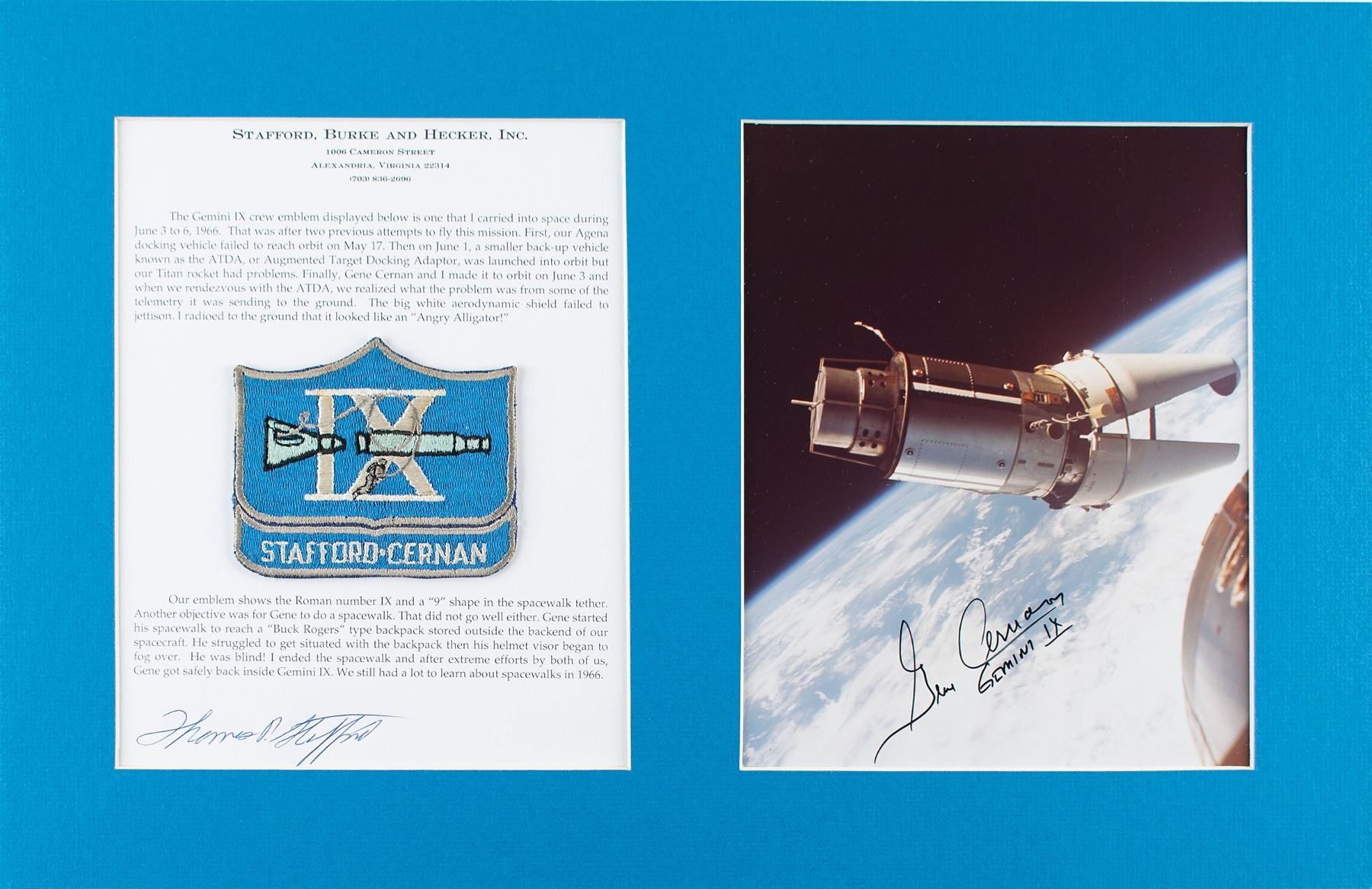 Fantastic large flown embroidered Gemini 9 mission patch, measuring 4˝ x 3.5˝, affixed to a letter of provenance signed in blue ballpoint by Command Pilot Tom Stafford, in part: "The Gemini IX crew emblem patch displayed below is one that I carried into space during June 3 to 6, 1966. That was after two previous attempts to fly this mission. First, our Agena docking vehicle failed to reach orbit on May 17. Then on June 1, a smaller back-up vehicle known as the ATDA, or Augmented Target Docking Adaptor, was launched into orbit but our Titan rocket had problems. Finally, Gene Cernan and I made it to orbit on June 3 and when we rendezvous with the ATDA, we realized what the problem was from some of the telemetry it was sending to the ground. The big white aerodynamic shield failed to jettison. I radioed to the ground that it looked like an 'Angry Alligator!'…Our emblem shows the Roman number IX and a '9' shape in the spacewalk tether." The patch and letter are matted alongside a color satin-finish 7.25 x 9.25 photo of the 'Angry Alligator' as seen from the Gemini spacecraft, signed in black felt tip, "Gene Cernan, Gemini IX." The display measures an overall 19.5 x 12.5. In fine condition.