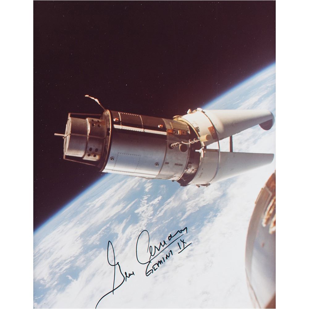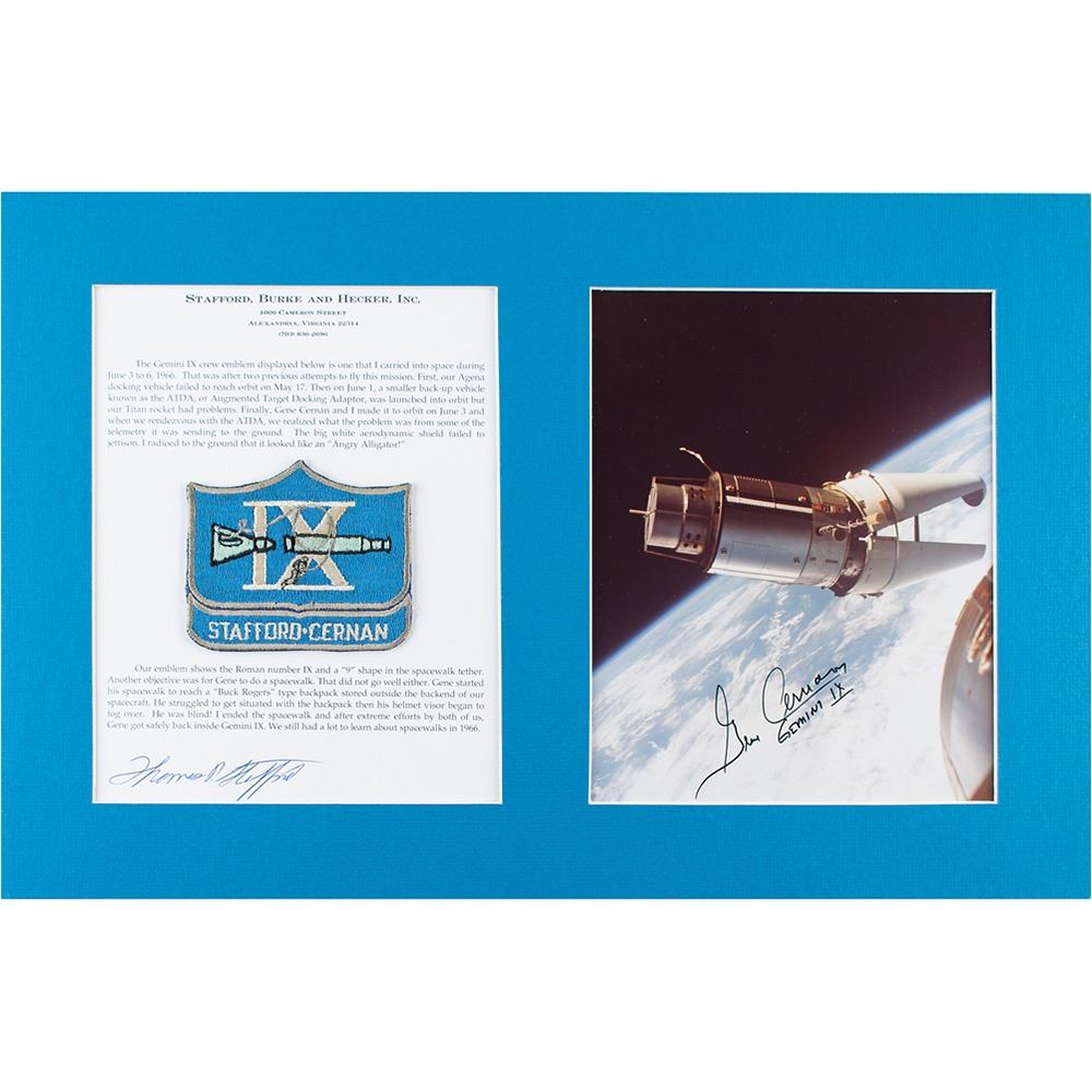 Fantastic large flown embroidered Gemini 9 mission patch, measuring 4" x 3.5", affixed to a letter of provenance signed in blue ballpoint by Command Pilot Tom Stafford, in part: "The Gemini IX crew emblem patch displayed below is one that I carried into space during June 3 to 6, 1966. That was after two previous attempts to fly this mission. First, our Agena docking vehicle failed to reach orbit on May 17. Then on June 1, a smaller back-up vehicle known as the ATDA, or Augmented Target Docking Adaptor, was launched into orbit but our Titan rocket had problems. Finally, Gene Cernan and I made it to orbit on June 3 and when we rendezvous with the ATDA, we realized what the problem was from some of the telemetry it was sending to the ground. The big white aerodynamic shield failed to jettison. I radioed to the ground that it looked like an 'Angry Alligator!'‰Û_Our emblem shows the Roman number IX and a '9' shape in the spacewalk tether." The patch and letter are matted alongside a color satin-finish 7.25 x 9.25 photo of the 'Angry Alligator' as seen from the Gemini spacecraft, signed in black felt tip, "Gene Cernan, Gemini IX." The display measures an overall 19.5 x 12.5. In fine condition.
