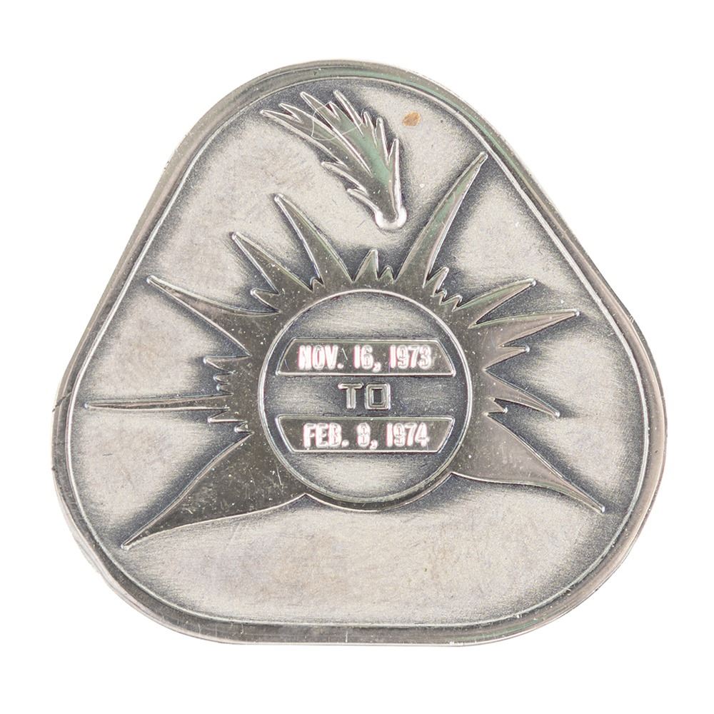 Tom Stafford’s unflown sterling silver Skylab 4 (SLM-3) Robbins medallion, approximately 1.5Ë x 1.25Ë, with a raised mission insignia design on the face, and the reverse engraved with the Skylab launch date of November 16, 1973, and the landing date of February 8, 1974. The edge bears the serial number "131" and the original matching plastic case is included. Condition is mint state. Accompanied by a letter of authenticity signed by Stafford, who states: “I received this medallion from the Skylab 3 crew while I was working as Deputy Director of Flight Crew Operations at the NASA Manned Spacecraft Center.â€