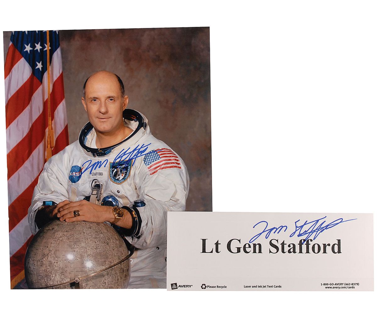 Color satin-finish 11 x 14 photo of Stafford in his Apollo spacesuit, signed in blue felt tip; a printed 11 x 3.5 table name card, signed on one side in blue felt tip; a pad of 6 x 9 Committee on Science, Space, And Technology, U S House of Representatives stationery, with several pencil notations by Stafford, “Proverbs 29:18,” “II,” and “Ranking member.” Also included is a two-page typescript of Stafford’s testimony in front of the commission, given on March 28, 2012. In fine condition.