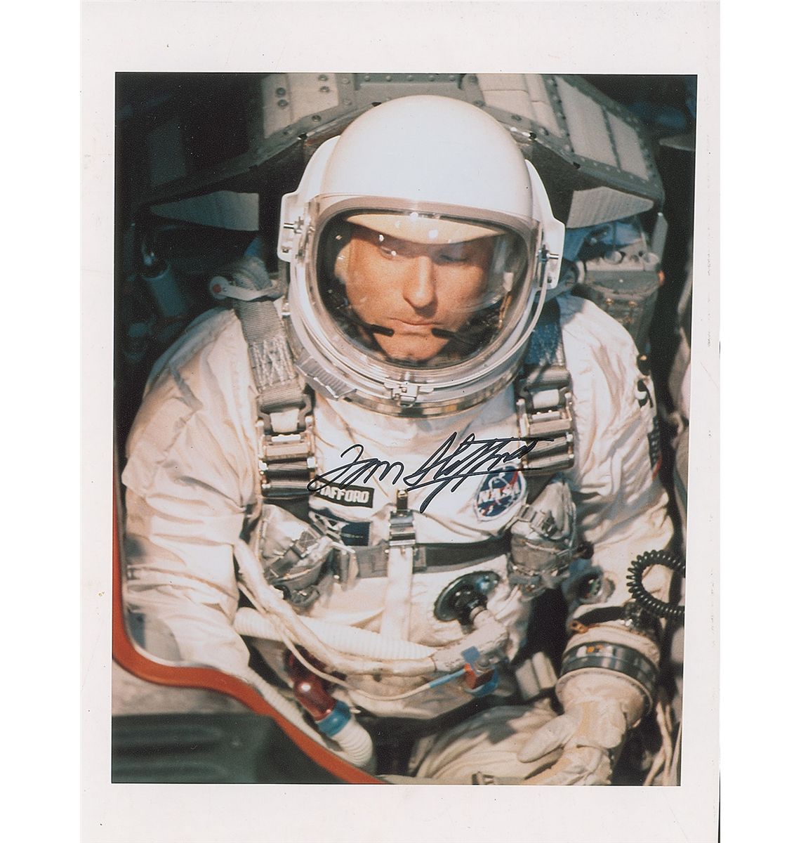 Color satin-finish 8 x 10 photo of Stafford suited up in his Gemini IX flight suit, signed in black felt tip. In very fine condition.