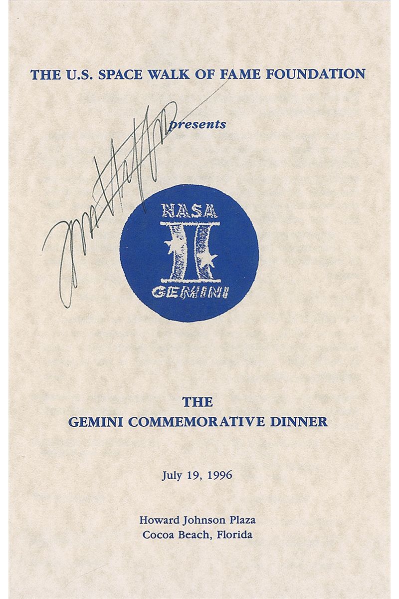 Program for a Gemini Commemorative Dinner presented by the US Space Walk of Fame Foundation on July 16, 1996, 5.5 x 8.5, two pages, signed on the front cover in black ballpoint. In fine condition.