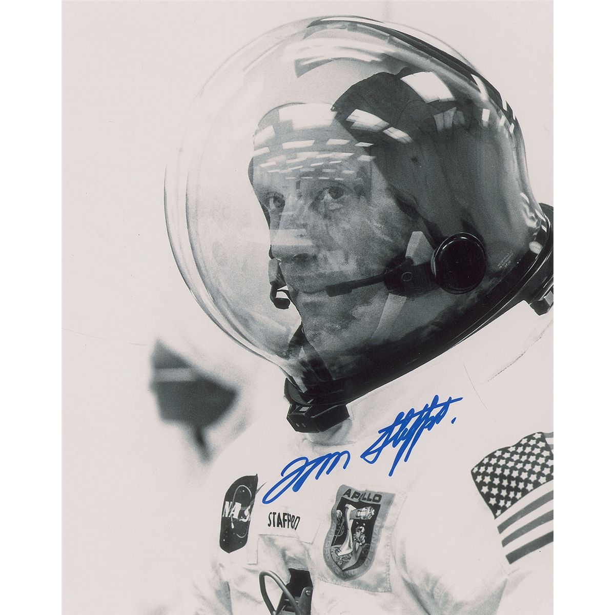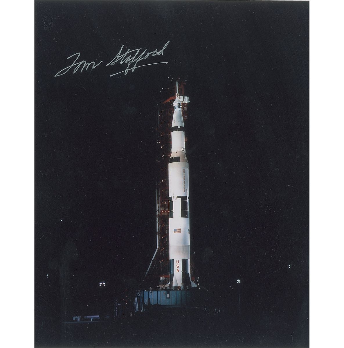 Two satin-finish 8 x 10 photos: one of the Apollo 10 spacecraft on the launch pad, signed in silver ink; and one of Stafford in his white space suit before his mission, signed in blue felt tip. In very fine condition.