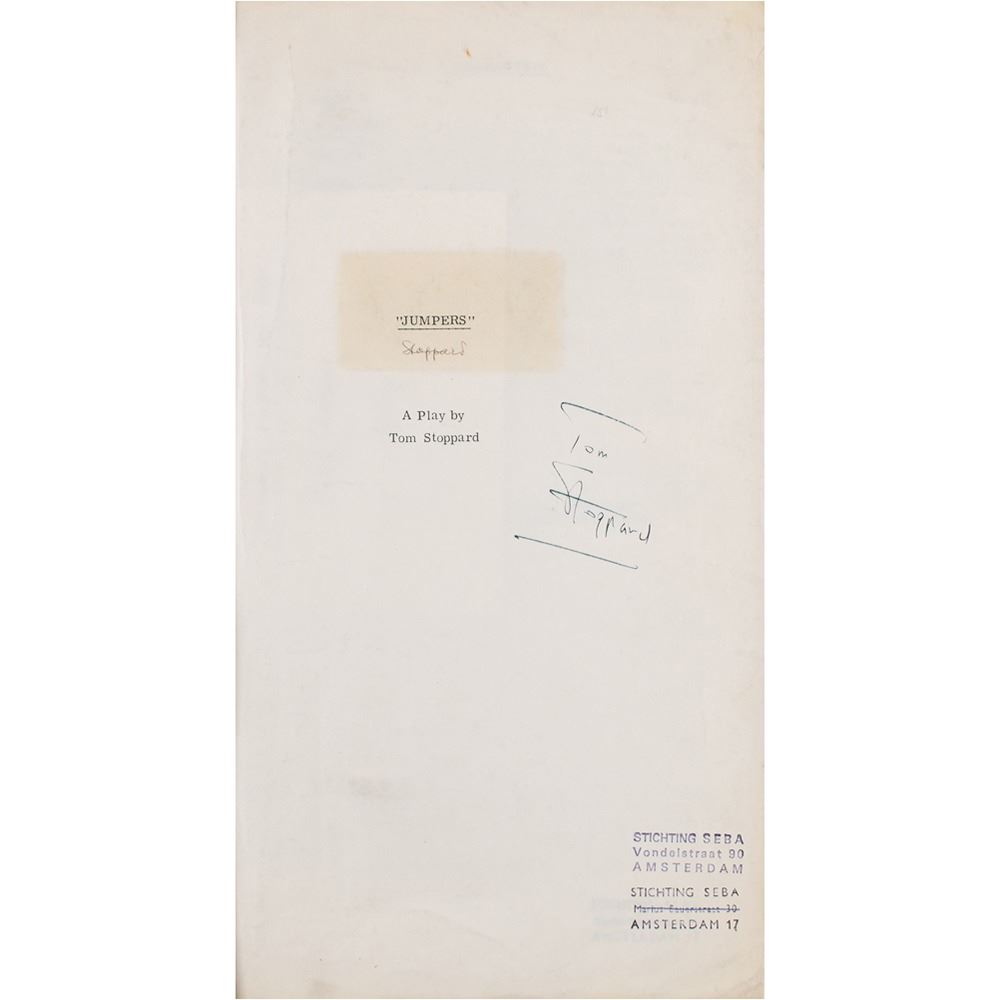Script for the 1972 play 'Jumpers,' 63 pages, 8.25 x 13.25, signed boldly on the title page in black ink, "Tom Stoppard." In very good to fine condition, with light creasing and handling wear. A satirical farce, Jumpers explores the field of academic philosophy. Accompanied by a stationery card signed by Stoppard's longtime assistant, Jacky.