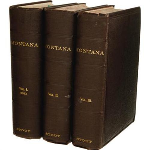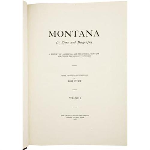 <B>Tom Stout: <I>Montana: Its Story and Biography.</B></I></B></I><I> A History of Aboriginal and Territorial Montana and Three Decades of Statehood. Under the Editorial Supervision of Tom Stout. Volume I <I>I, III .</B></I> (Chicago and New York: The American Historical Society, 1921). First edition. Three thick quarto volumes (10.5” x 7.25”). xlix, 894; 654; 655 -1449 pp. Profusely illustrated. Index at the front of Volume I. Handsome publisher's bindings of morocco-grained brown cloth, bordered in blind on the covers and lettered in gilt on the spine. All edges marbled, and with marbled endpapers. Very minor rubbing, else an attractive set in very good condition.<BR><BR><b>Shipping:</b> Books & Catalogs (<a target="_blank" href="http://www.heritageauctions.com/common/shipping.php">view shipping information</a>)
