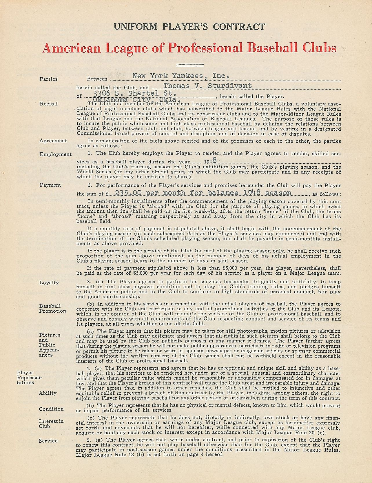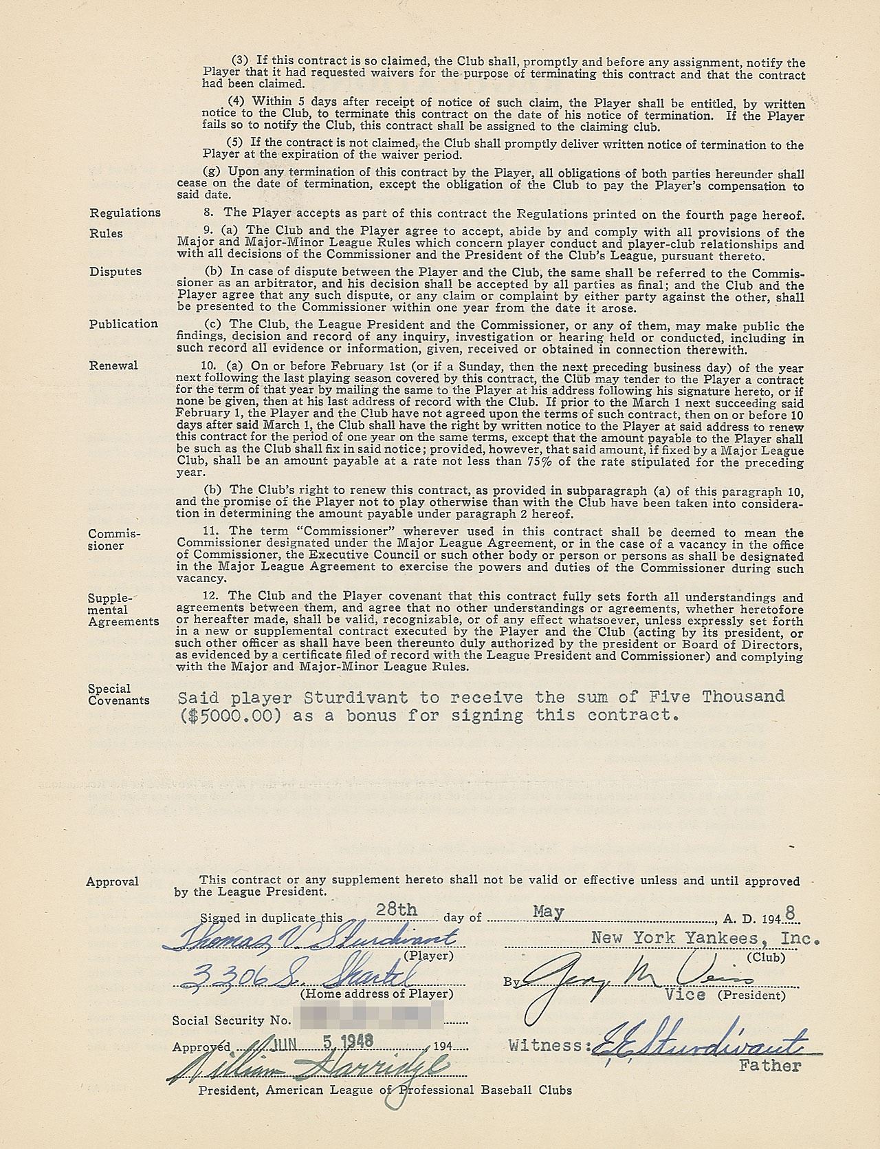 Contract, signed “Thomas V. Sturdivant,” four pages on two adjoining sheets, 8.5 x 11, May 28, 1948. American League uniform player’s contract in which the 18-year-old Tom Sturdivant agrees to render "skilled services as a baseball player during the year 1948” for the New York Yankees, for a salary of “$235.00 per month for balance of 1948 season.” Signed at the conclusion in fountain pen by Sturdivant, who adds his address and social security number, and countersigned by his father, E. E. Sturdivant, Yankees General Manager George Weiss, and by American League President William Harridge. A special covenant notes that Sturdivant is to receive a $5,000 signing bonus. In fine condition. Sturdivant would spend seven years in the minor leagues, breaking into the Majors in 1955 on the strength of his sharp curveball.