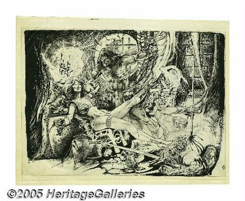 <B>Tom Sutton - Conan and Red Sonja Pin-Up Original Art (undated).</B></I> Conan plies Red Sonja with wine and jewels after slaying the hapless guardian of a treasure vault. Barbarians sure know how to party! This detailed pencil and pen pin-up was drawn on vellum which was taped to a larger support board. Tom Sutton titled his work "Victory Celebration." The board measures an overall 20" x 15.5", with an image area of 18.5" x 13.5", and the art is in Excellent condition. By Crom, any Red Sonja fan will treasure this drawing for years to come!