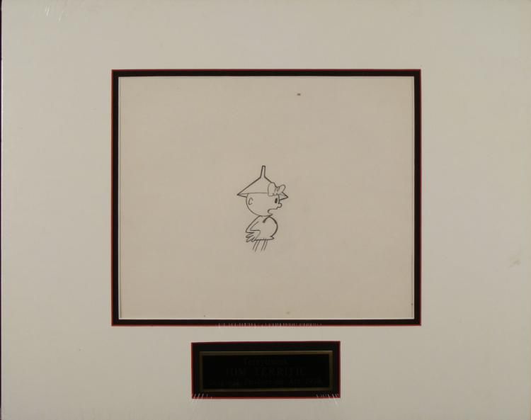 Here is a rare original drawing used in the production of a Tom Terrific cartoon. This Terrytoons creation was made for the Captain Kangaroo show, and the little boy hero with his "thinking cap" has since become a favorite character. * Medium: Black pencil on paperImage size: 9 x 11 inchesDetails: Number 61 at the lower right, possibly a scene numberPresentation: Double matted in black and white with red inner trim; black and brass engraved plaque, also mattedMatte size: 16 x 20 inchesCondition: Excellent; has a few light surface wrinkles, normal for a production drawing; sealed in cellophane, slight tear on backIncludes: Printed sketch sample on back