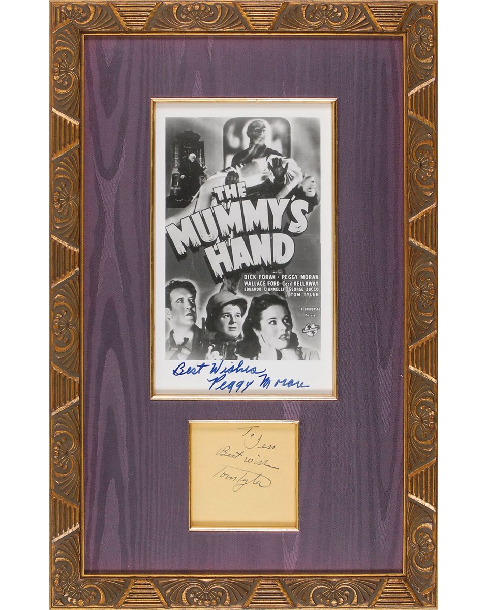 Two items: vintage ink signature and inscription, “To Jess, Best wishes, Tom Tyler,” on an off-white 3.25 x 3.25 album page; and a glossy 5.75 x 9 photo of a poster for The Mummy’s Hand, signed in the lower border by Peggy Moran. Beautifully cloth-matted and framed to an overall size of 12.5 x 19. In fine condition. Tyler (1903–1954) was a popular American star of silent and early sound Westerns and serials, but to horror fans he is remembered for his role as the mummy Kharis in the 1941 Universal film The Mummy's Hand, which also starred Moran (1918–2002) as Marta Solvani.