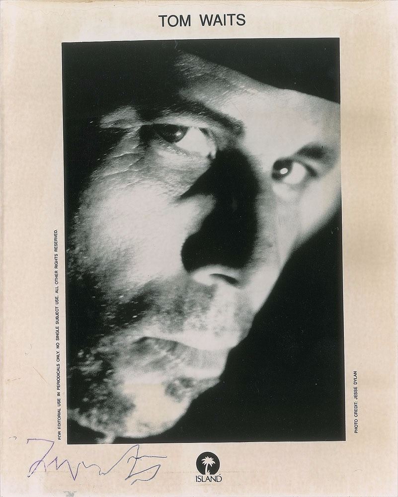 Semi-glossy 8 x 10 Island Records publicity photo of Waits with an intense, close-up pose, signed in the lower border in black ballpoint. In fine condition, with scattered light creasing, and a piece of clear tape over the first name of the signature.
