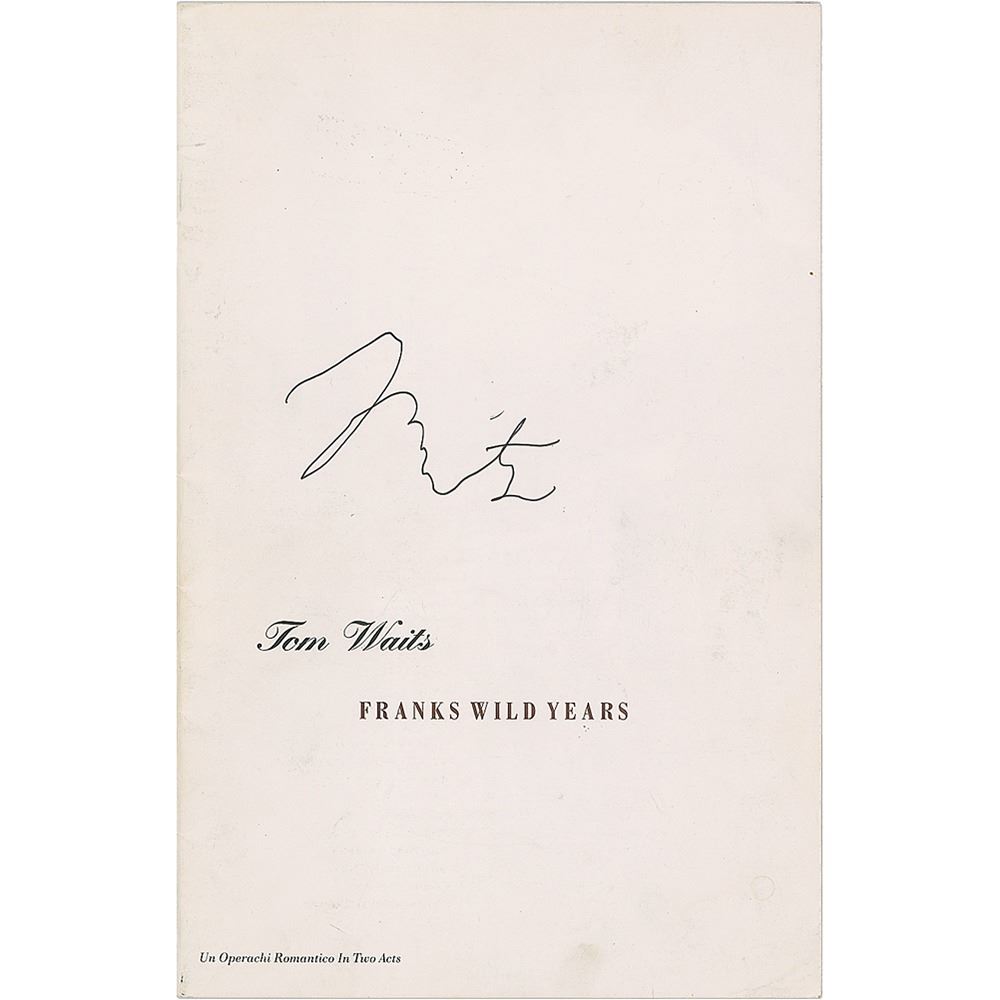 Program for Franks Wild Years, 24 pages, 7.5 x 11.5, signed on the front cover in blue felt tip by Tom Waits. In fine condition, with light handling wear.