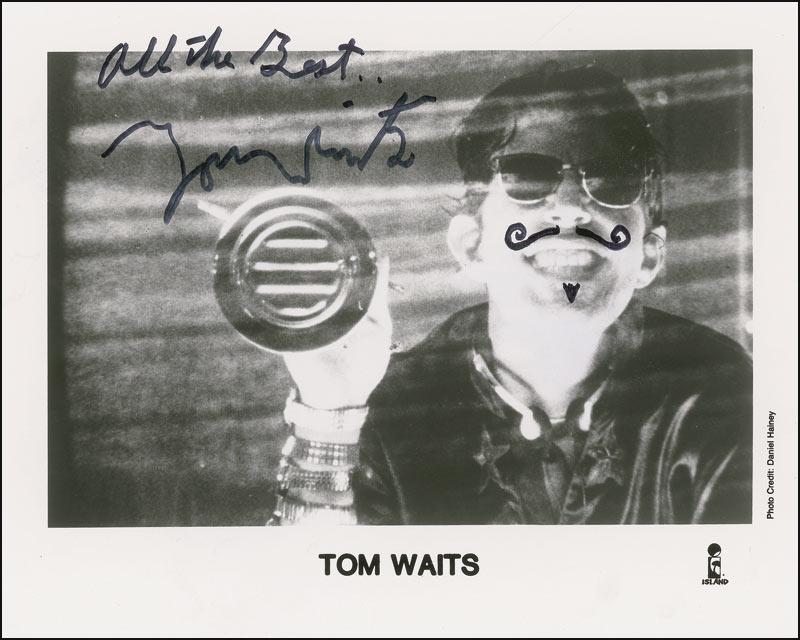 Uncommon satin-finish 10 x 8 Island publicity photo, signed in black felt tip, “All the best, Tom Waits.” In very fine condition.