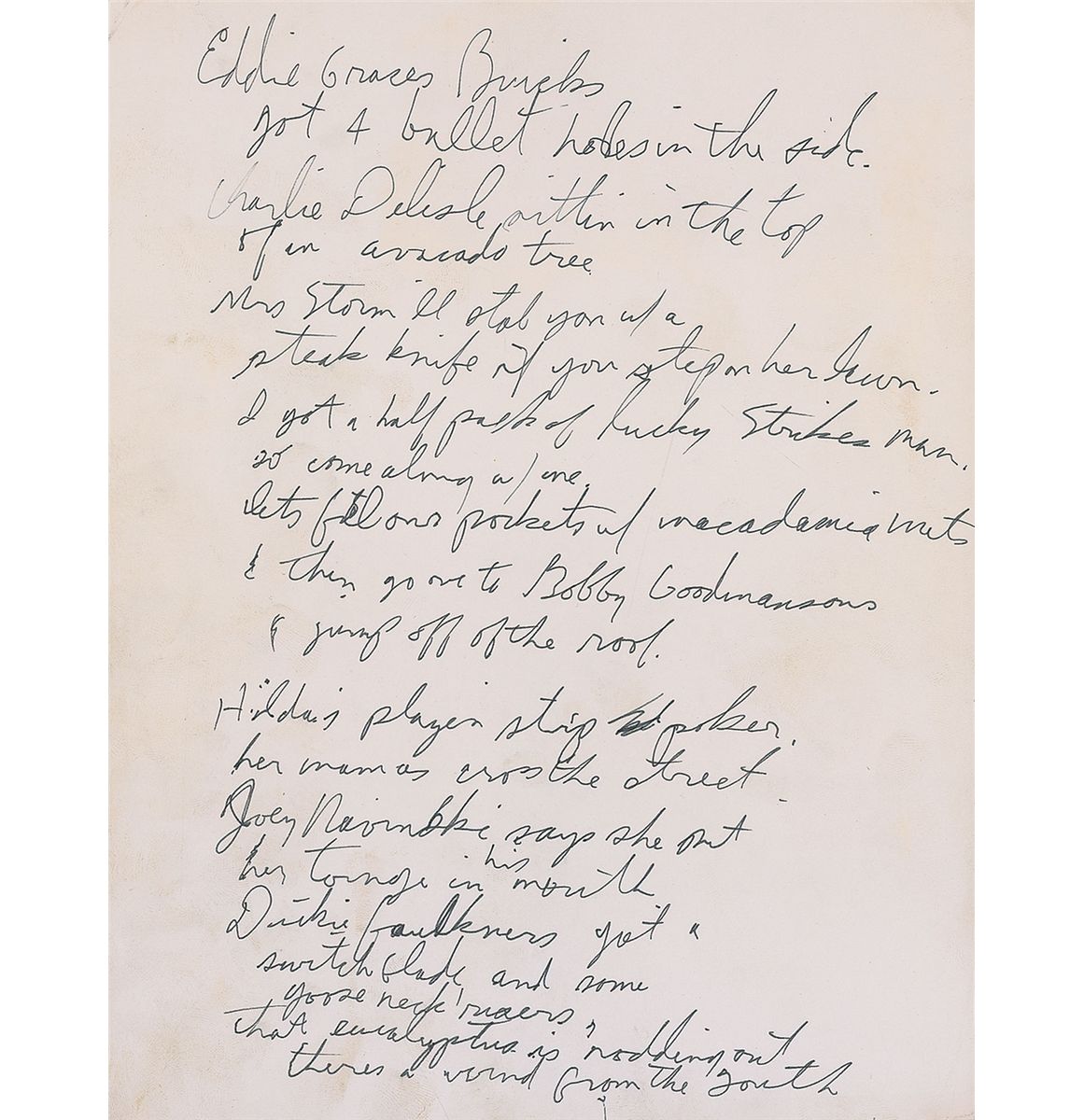 Handwritten working lyrics to Waits’s song ‘Kentucky Avenue,’ on three off-white 8.5 x 11 sheets. Waits pens 51 total lines (crossing out two near the end), and the lyrics read, in part (with grammar and spelling retained): “Eddie graces buicks / got 4 bullet holes in the side / Charlie Delisle sittin at the top / of an avocado tree / Mrs stormll stab you w/ a / steak knife if you step on her lawn. / I got a half pack of lucky strikes man / come along w/ me / Lets fill our pockets with macadamia nuts / Then go over to bobby goodmansons / And jump off the roof/ Hilda plays strip poker / her mamas across the street / Joey navinski says she put / her tongue in his mouth / Dicky faulkners got / a switchblade and some / gooseneck risers…Bring a chuch key / in your pocket / & we’ll hop that / freight train in the hall / and well / both slide down the / drain / and be in / New Orleans in the fall.” In fine condition, with some creases to lower left corners. Originally written for his 1978 album Blue Valentine, and named for the street he grew up on in Whittier, California, the song contains autobiographical elements and references to real people from his childhood.