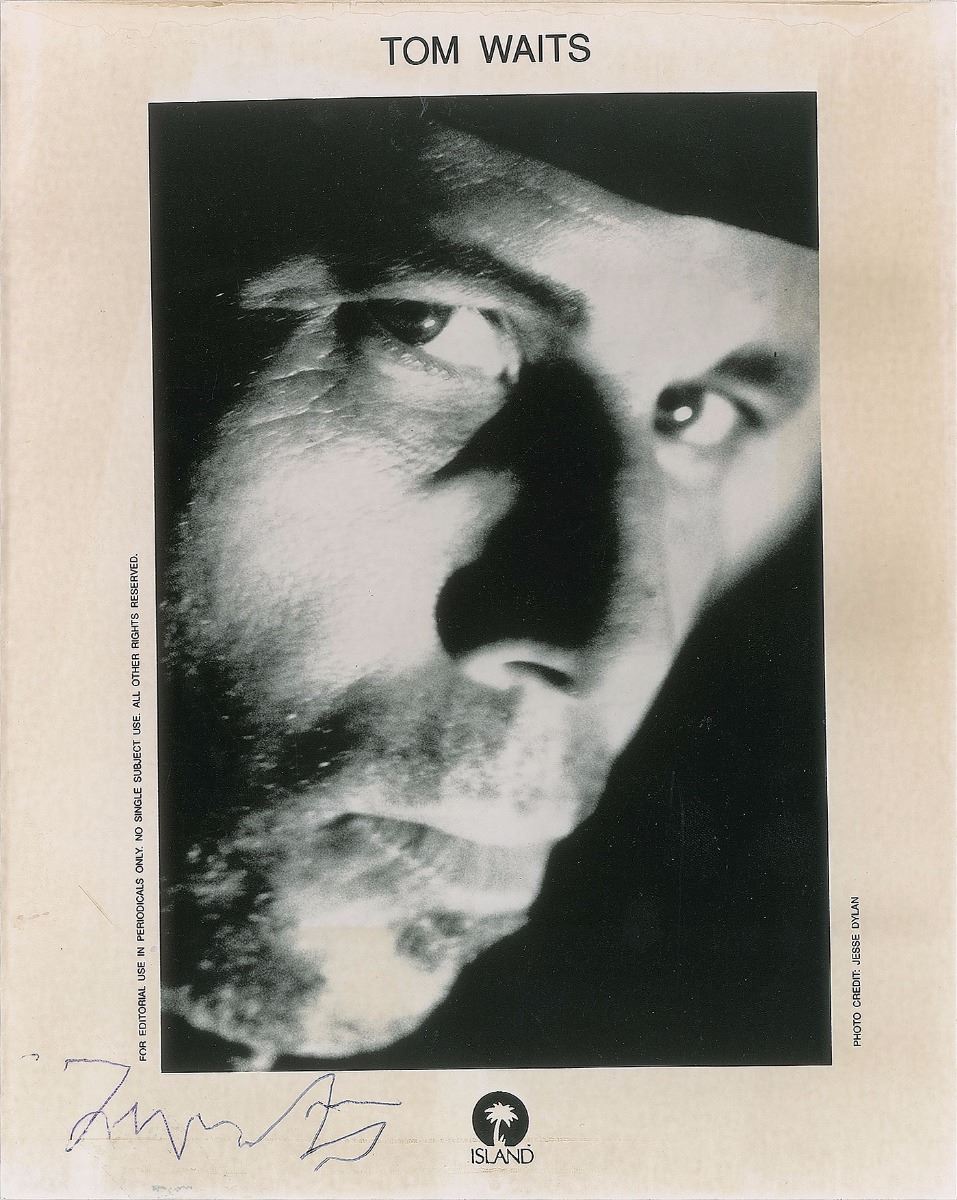 Satin-finish 8 x 10 Island Records publicity photo of Waits in an intense close-up pose, signed in black ballpoint. In very good to fine condition, with some small creases, light mottled toning, and a piece of clear tape over much of his first name.
