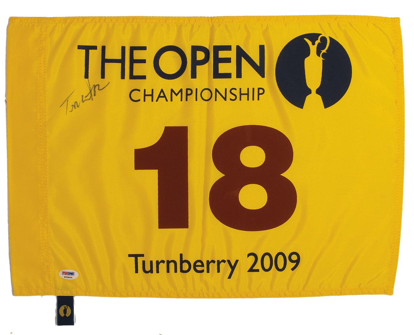 Souvenir 2009 British Open golf flag, 19 x 13.5, signed in black felt tip on the front. In fine condition, with a central vertical fold, expected light feathering to signature from nature of material, and a PSA/DNA authentication label affixed to bottom corner.