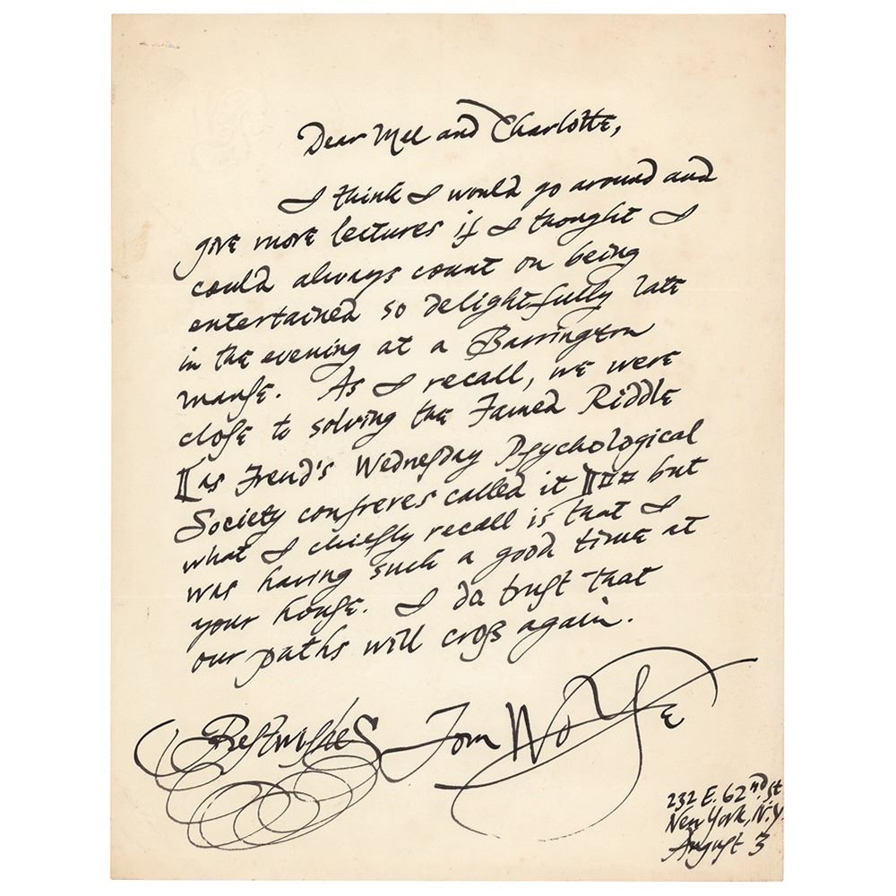 ALS, one page, 8.5 x 11, personal embossed letterhead, no date. Handwritten letter to Mel and Charlotte, in full: "I think I would go around and give more lectures if I thought I could always count on being entertained so delightfully late in the evening at a Barrington manse. As I recall, we were close to solving the Famed Riddle (as Freud's Wednesday Psychological Society confreres called it) but what I chiefly recall is that I was having such a good time at your house. I do trust that our paths will cross again." In fine condition.