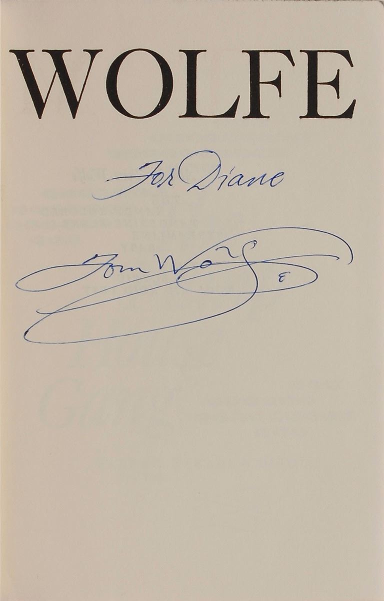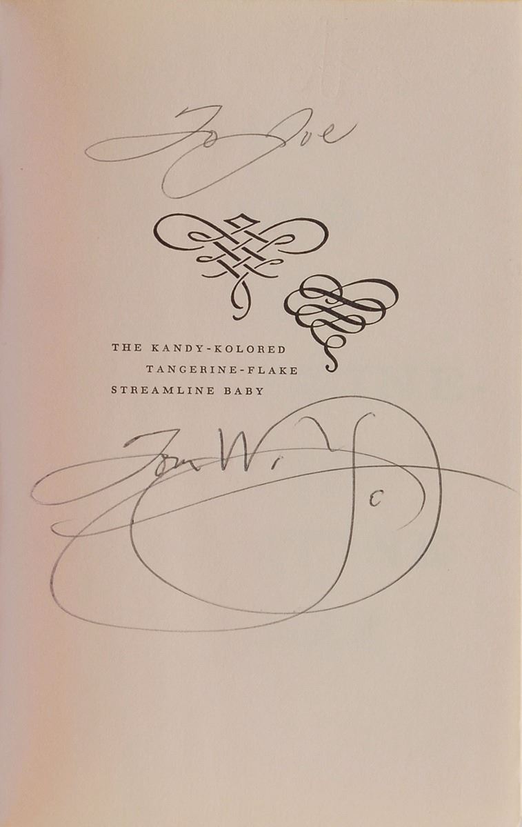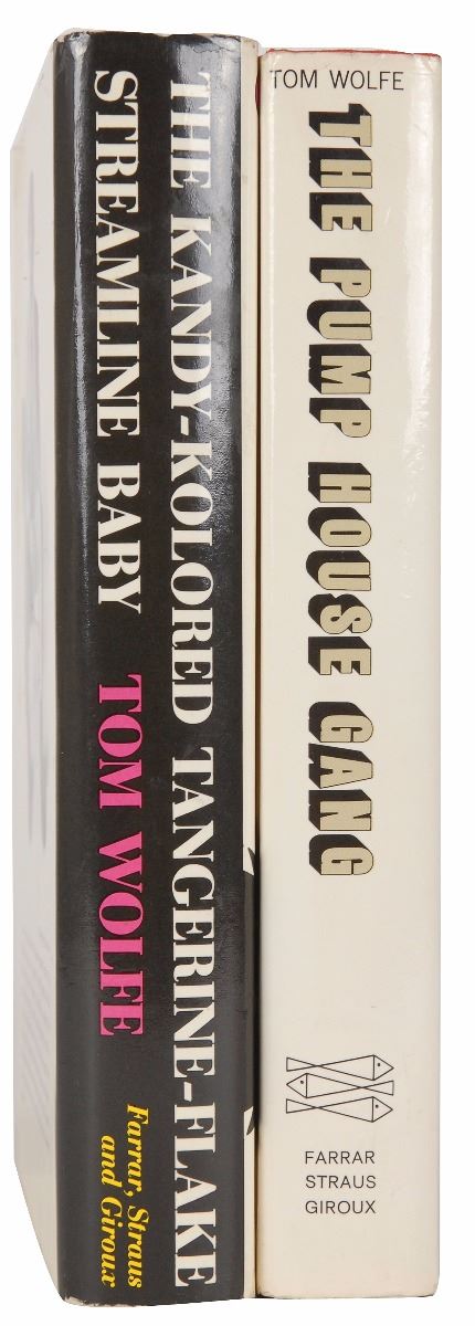 Two signed books: a first edition of The Kandy Kolored Tangerine Flake Streamline Baby, hardcover with dust jacket, signed and inscribed on the half-title page in black ballpoint, “To Joe, Tom Wolfe”; and a first edition of The Pump House Gang, hardcover with dust jacket, signed and inscribed on an opening page in blue ballpoint, “For Diane, Tom Wolfe.” In overall fine condition.