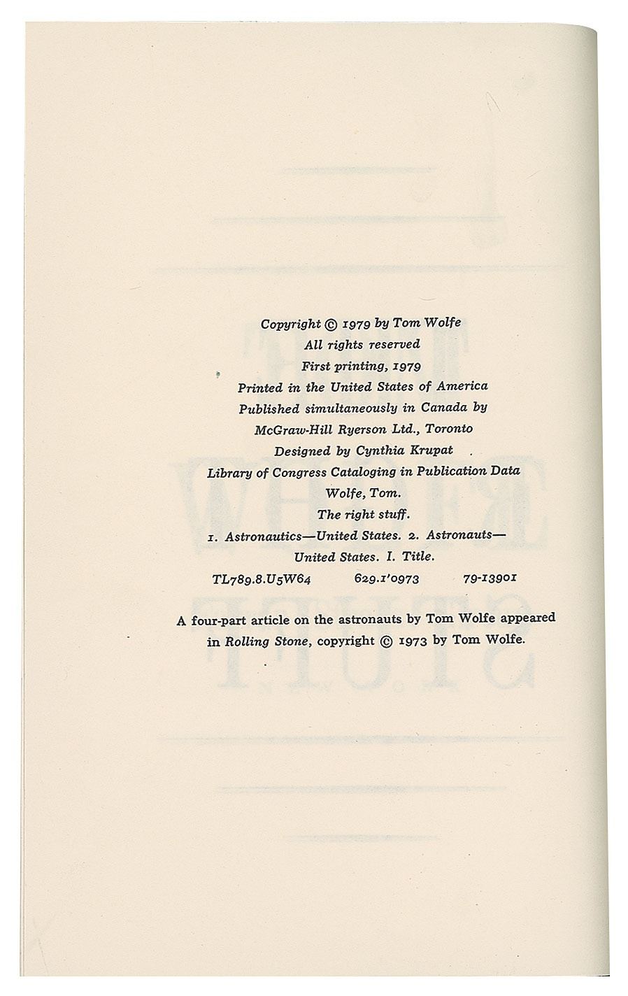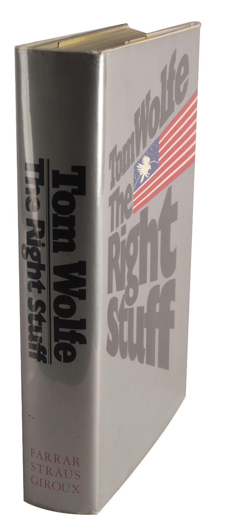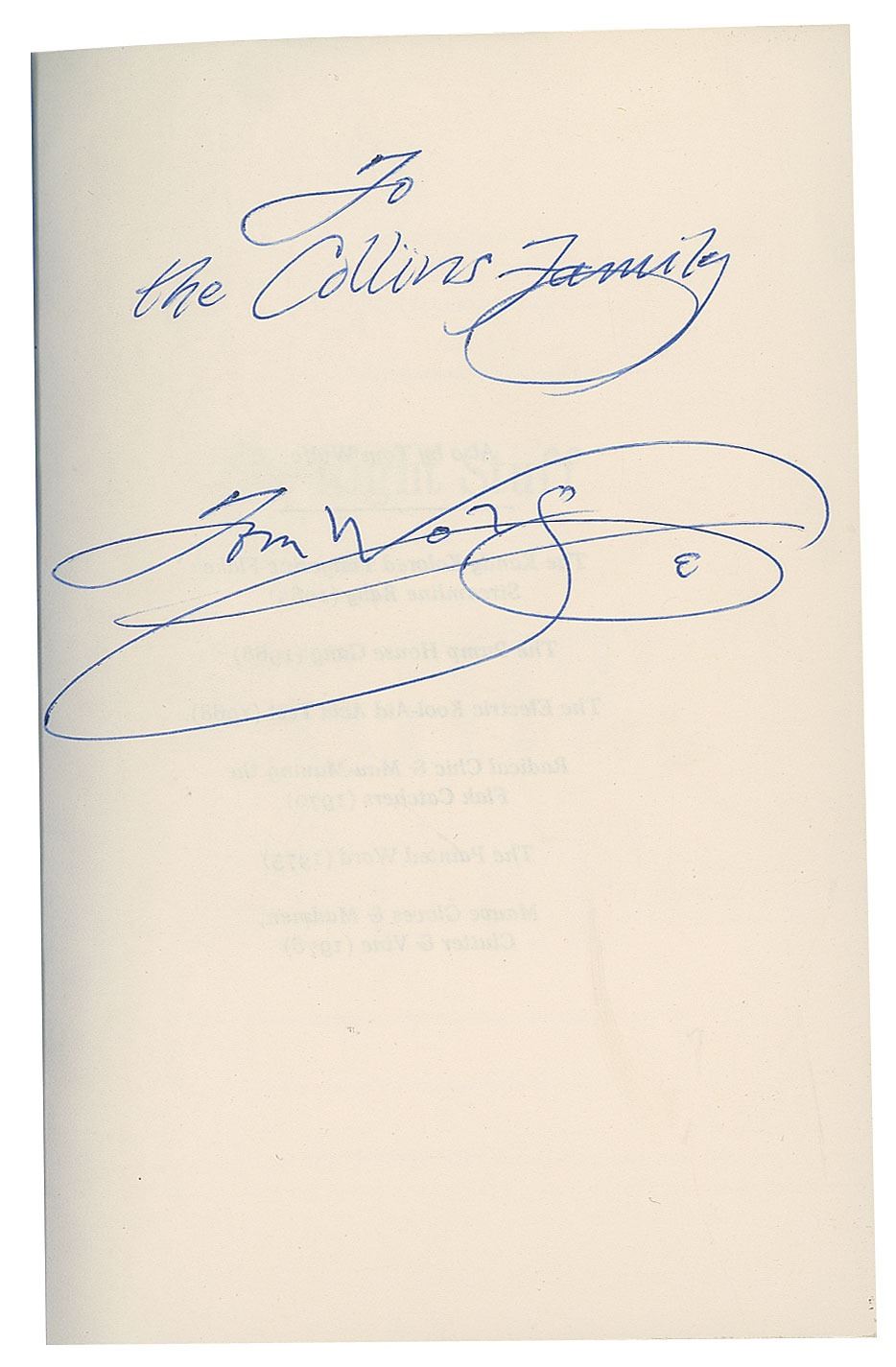 Signed book: The Right Stuff. First edition. NY: Farrar, Straus, Giroux, 1979. Hardcover with dust jacket, 5.75 x 8.5, 436 pages. Signed and inscribed on a free end page in blue ballpoint, "To the Collins Family, Tom Wolfe." In fine condition.