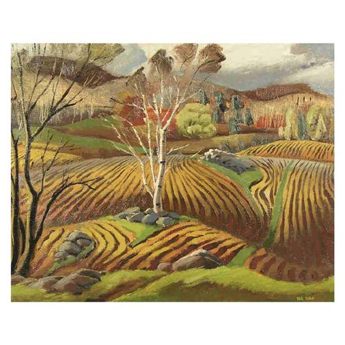 Canadian [20th century] AUTUMN FIELDS; ca 1935 oil on board 22 x 28 in. (55.9 x 71.1 cm) signed & titled