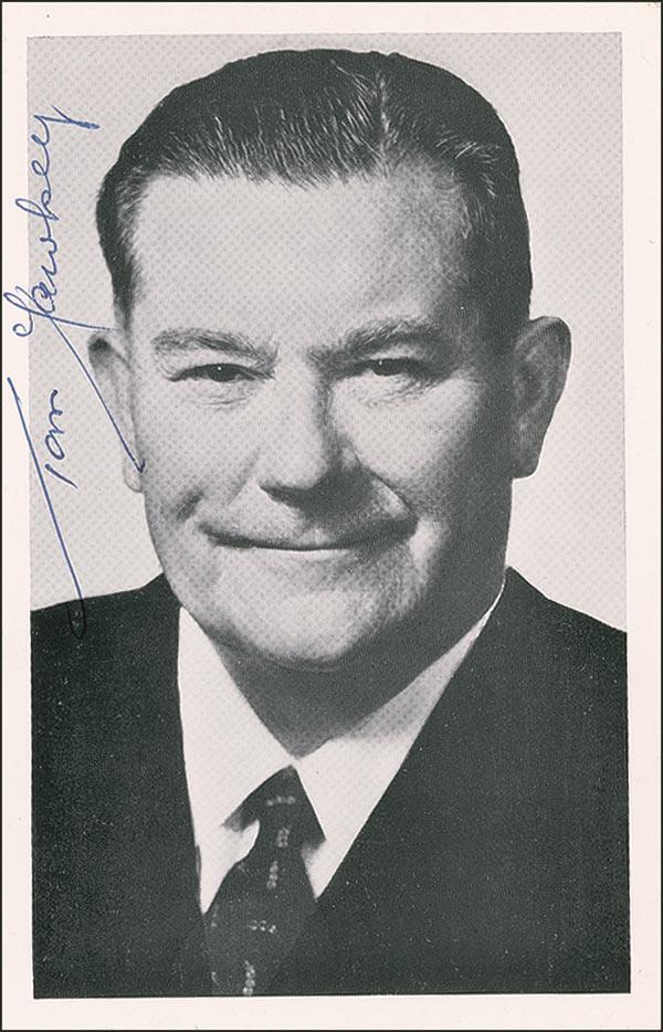 Baseball executive (1903–1976). Matte-finish 3.5 x 5.5 photo of Yawkey in a suit and tie, signed vertically in blue ballpoint. In fine condition. Yawkey became president of the Boston Red Sox in 1933, and was the sole owner of the team for 44 seasons, longer than anyone else in baseball history.