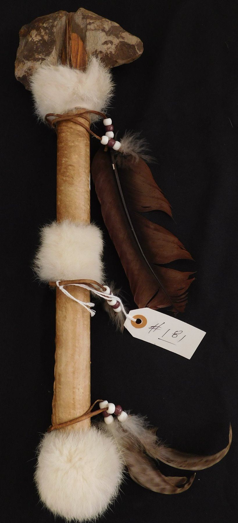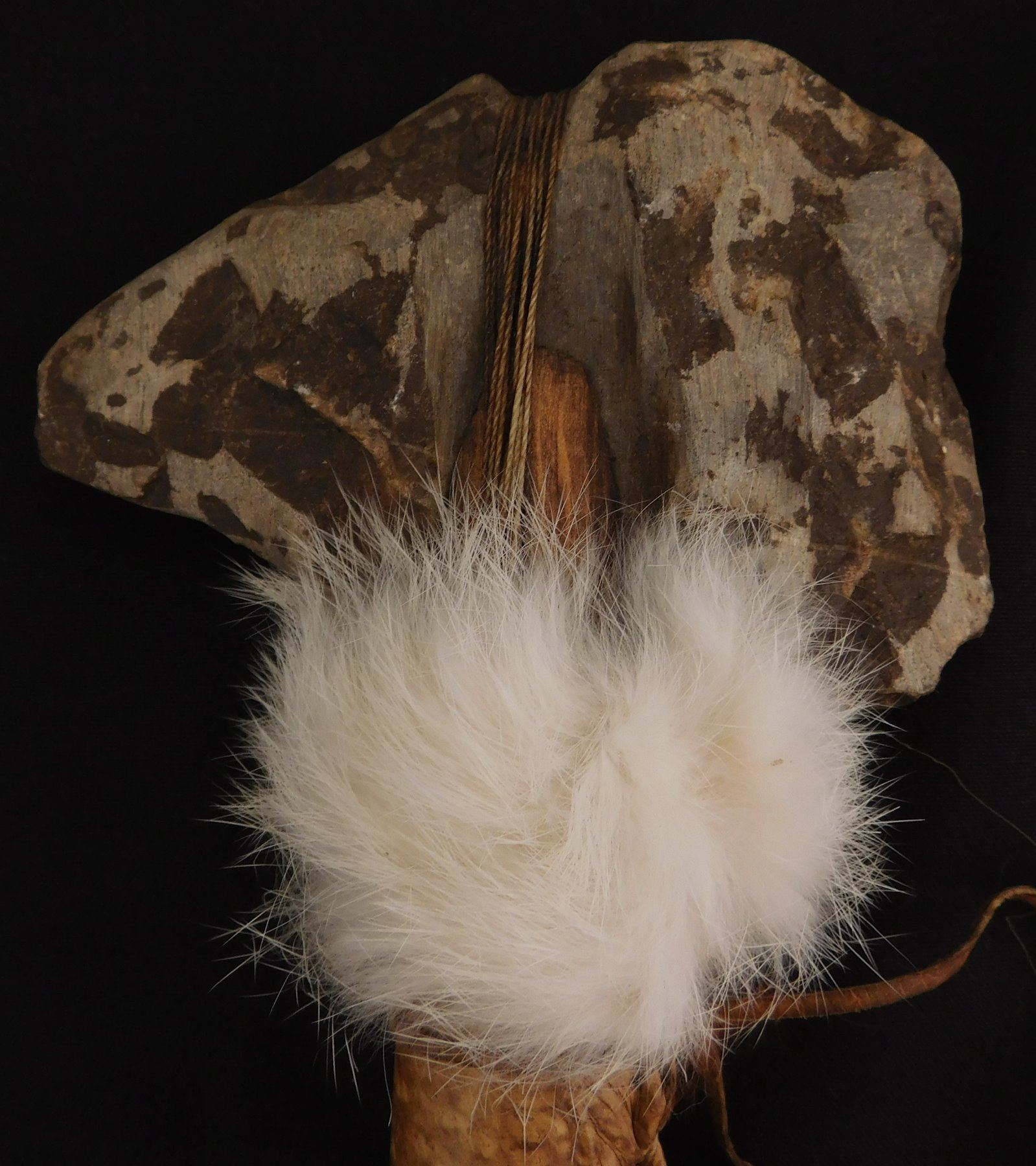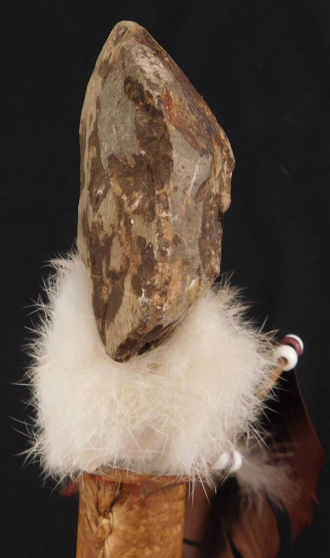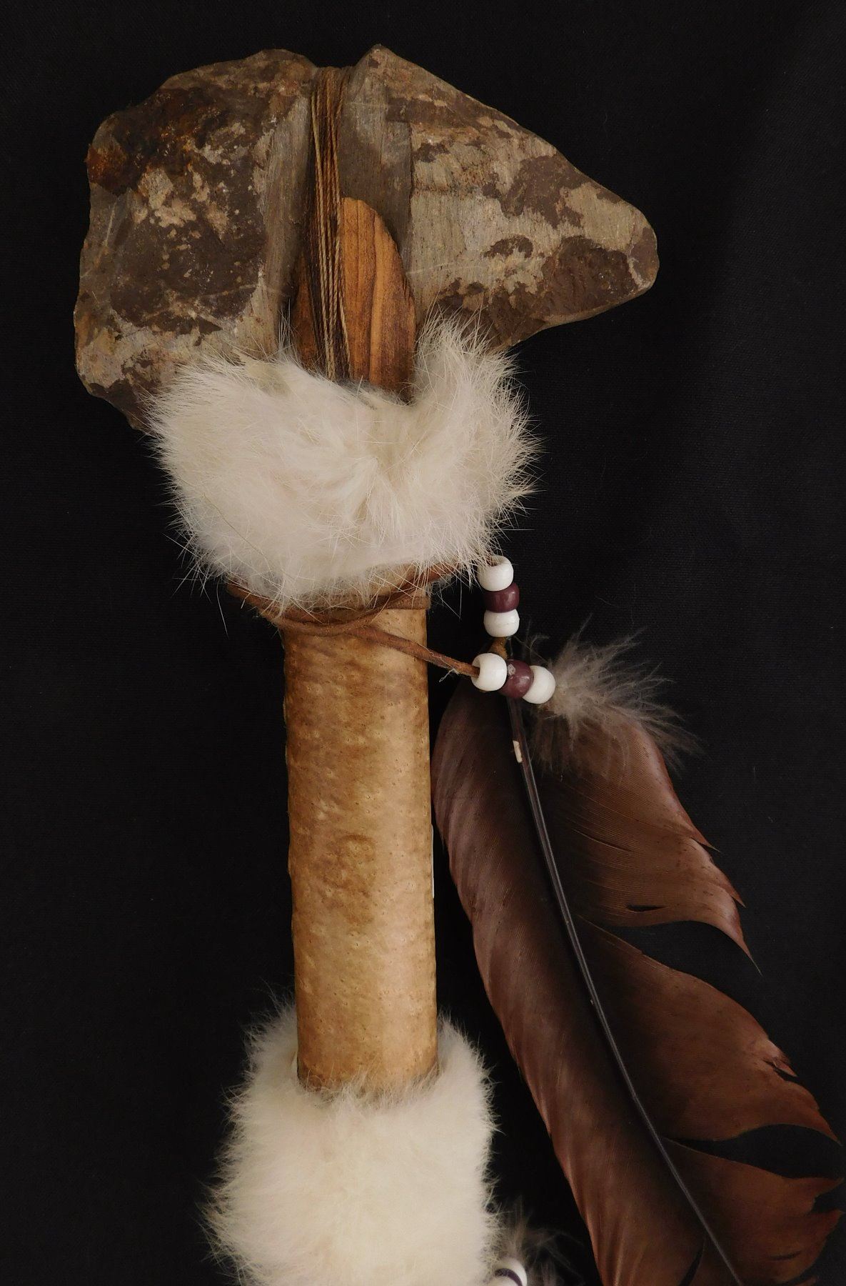 Tom-a-hawk Dance Club, c. 1960s. Made of stone, wood, feathers and rawhide, the item measures approx. 18.5" x 5" x 2". Sioux, South Dakota. The flint head measures 5" x 2 1/4". Condition: Good, see images. Shipping: $30.00 w/insurance and signature, due to length.