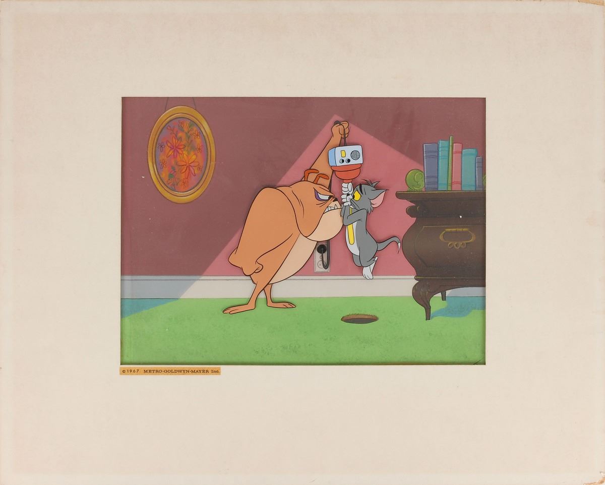 (MGM Studios, 1967) Original production cels and production background featuring Tom and Spike the Bulldog from a Chuck Jones-directed Tom and Jerry cartoon, showing the angry pooch lifting Tom from a hole in the floor, the worried cat clinging to a plunger and transistor radio. Total image measures 5.75 x 6.25, with a mat opening of 12 x 8.75. Mat dimensions are 20 x 16. Reverse of mat bears a Metro-Goldwyn-Mayer stamp. In fine condition, with slightly trimmed left edges to both cels. A rare and beautifully colored cel from one of television’s most creative and hilarious animated shows.