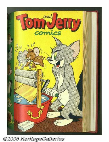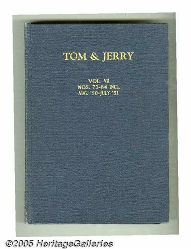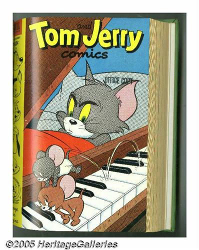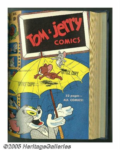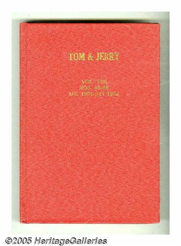 <B>Tom and Jerry #73-120 Bound Volume Group (Dell, 1950-54).</B></I> Here's a half-decade of fun featuring MGM's famous cat and mouse team, <B>Tom and Jerry</B></I>. Western Publishing file copies were bound and trimmed into these sturdy hardcover editions, originally designed for office reference use. Some covers are stamped "Office Copy", and some interior pages are marked with reprint information; still, most comics still look fresh and vibrant. Collecting bound volumes like these has become a favorite way to enjoy reading these great old comic masterpieces. There's plenty to enjoy here! Overstreet 2005 VG 4.0 value for group = $554. <I>From the Random House Archives.</B></I>